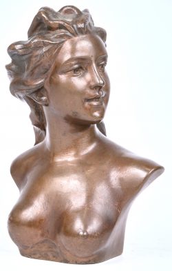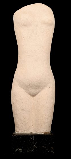 Een vrouwencorpus van witte steen. Met zwart marmeren sokkeltje. Gesigneerd.