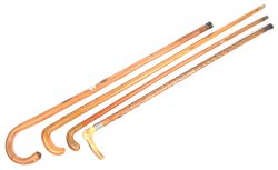 Een lot van 4 wandelstokken waarvan 2 in hout met snijwerk en 2 met hoornen handvat.