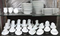 Een 131 delig porseleinen Limoges servies, gemerkt; Lafarge. Bestaande uit 21 grote borden, 13 diepe borden, 9 kleine borden, 10 dessertbordjes, 24 mokkatassen + 28 schoteltjes, 10 koffiekopjes + 12 schoteltjes, 2 suikerpotten en 2 melkkannetjes. Toegevoegd; 2 diepe borden en 2 dessertbordjes met schade.