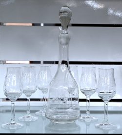 Een kristallen karafje met 6 borreltjes en geslepen bloemmotief.