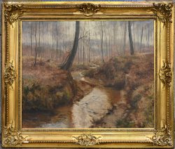 "Forest View with Babbling Brook", a painting, oil on canvas in a gilded frame, signed illegibly, dated 1933. The canvas restored in 2 places, minor damage to the frame.
