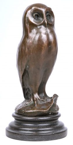 Een bronzen uiltje met donkere patina op een zwart marmeren sokkel, naar werk van Milo. Met bronsstempel.