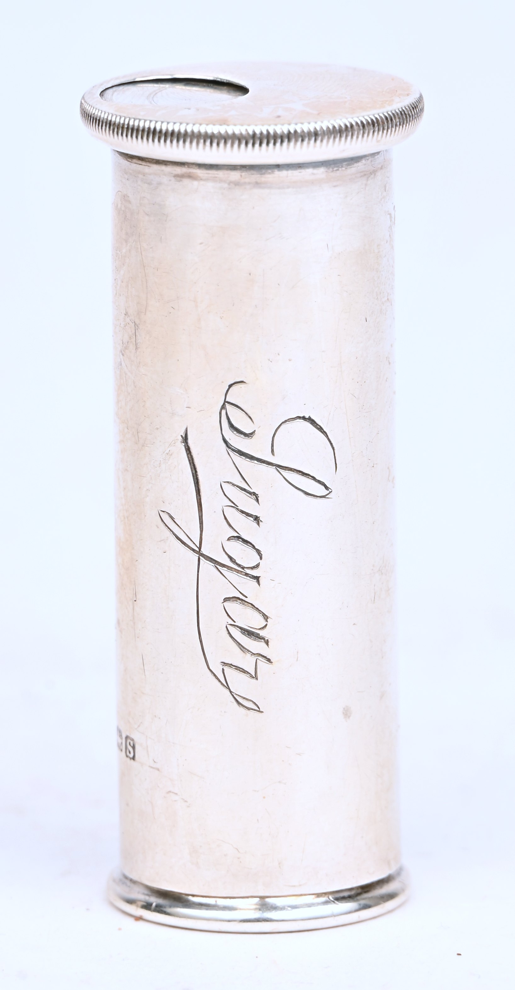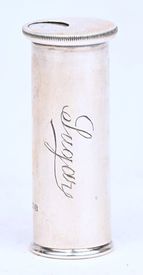 Een zilveren kokertje met verdeeldop en opschrift ‘Sugar’, Engeland, Birmingham 1917, zilversmid S.B&S LD. AR46
