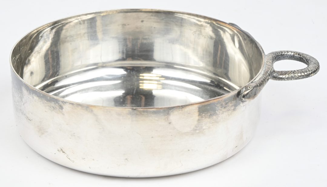 Een zilveren kommetjes met slang als handvat. Gemerkt.