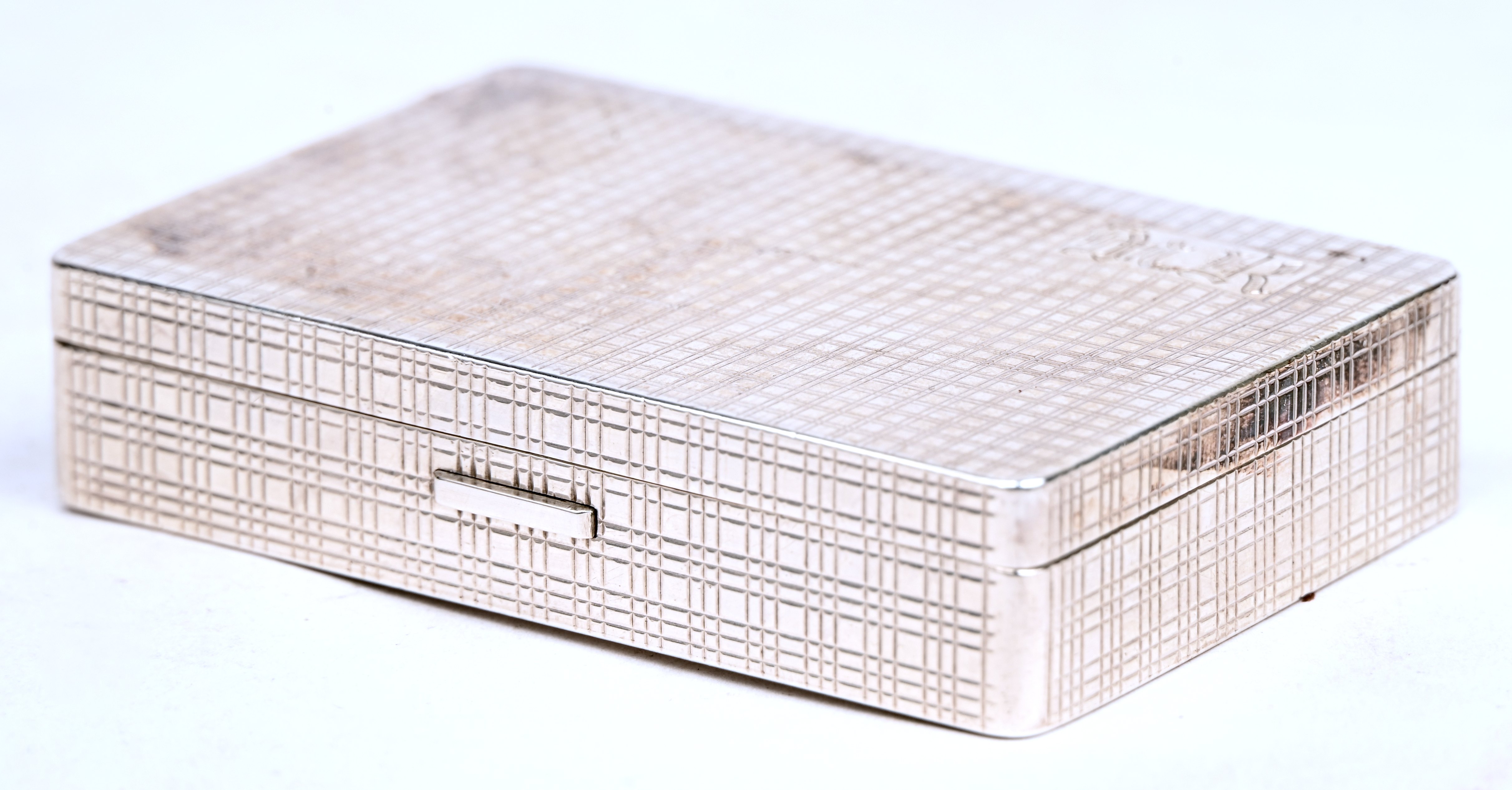 Een zilveren pillendoosje met de initialen M R in gegraveerd, gemerkt ‘Silver’. 100 gram. AR31