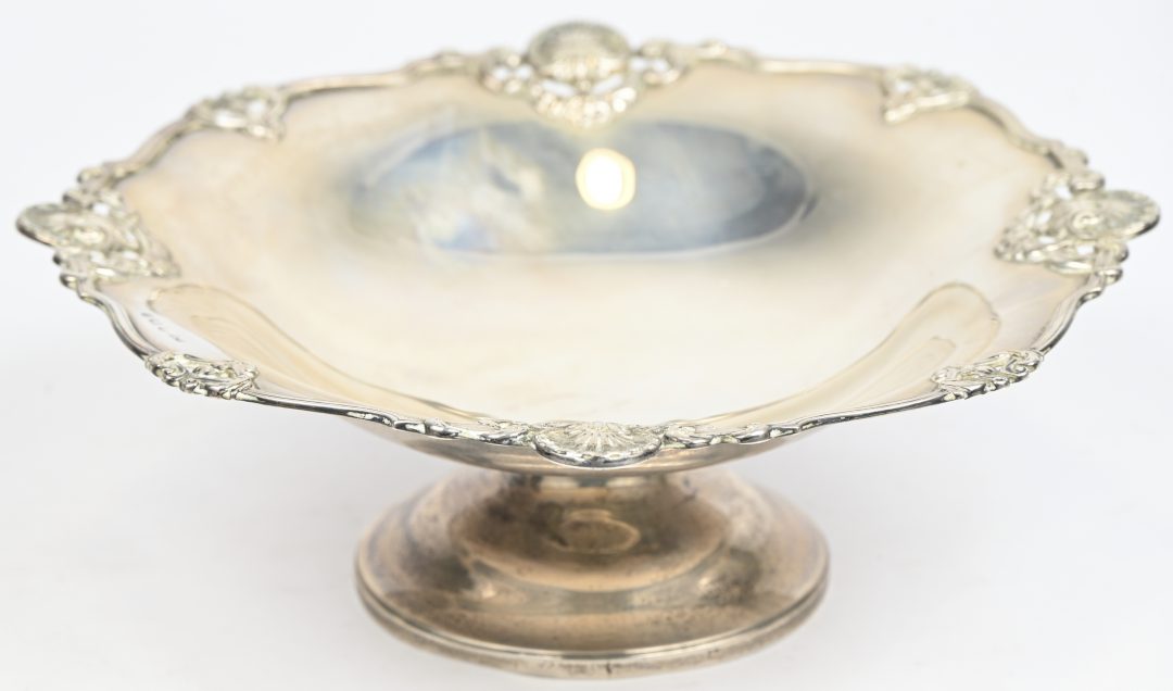 A silver dish on pedestal, marked Elkington & Company, Birmingham, date letter B = 1926, 595 grams.