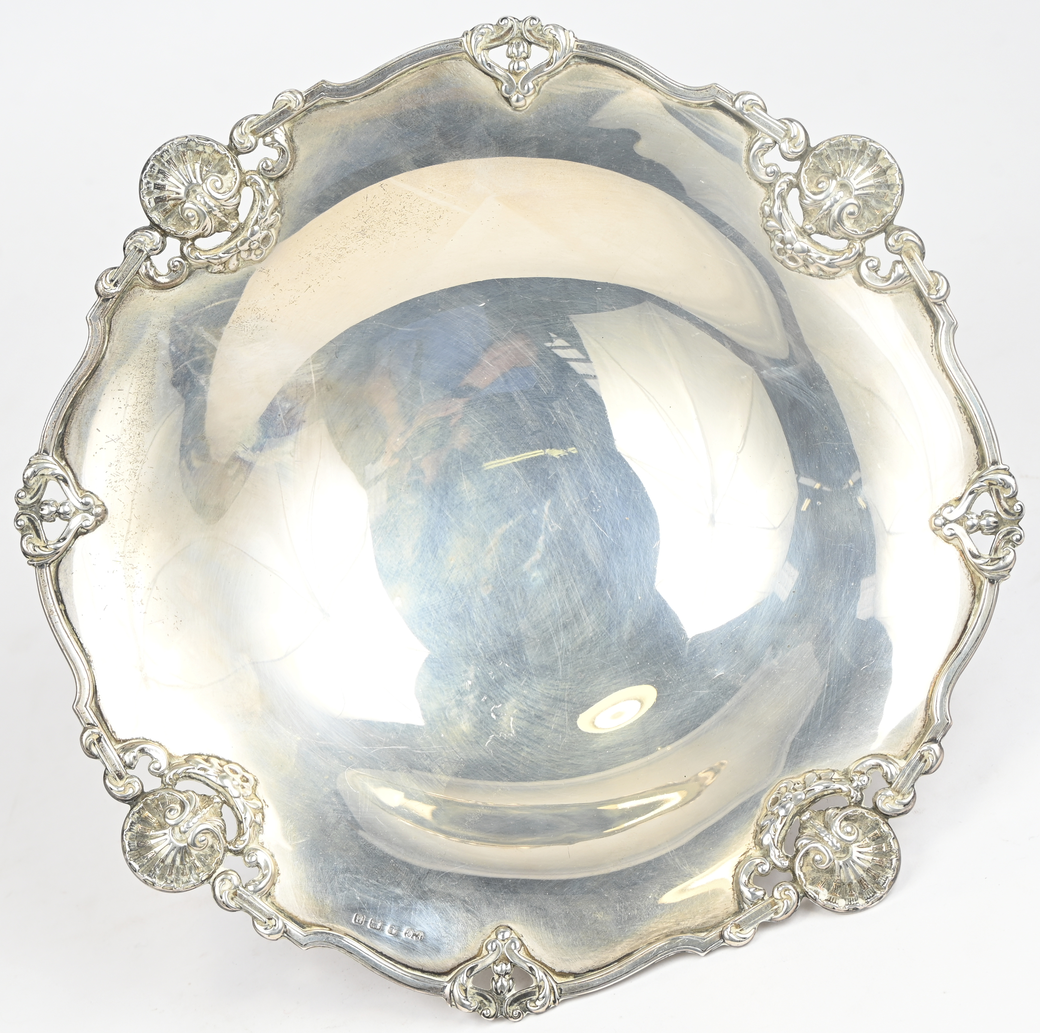 Een zilveren schaal op voet, gemerkt Elkington & Company, Birmingham, jaarletter B = 1926, 595 gram.