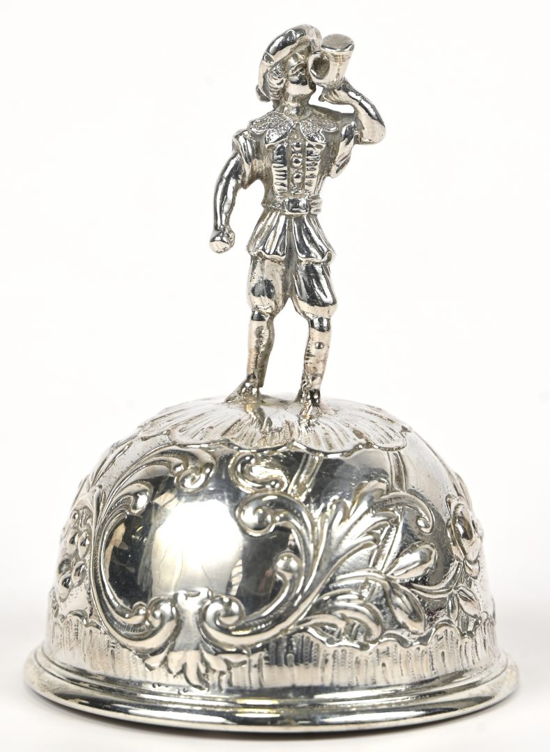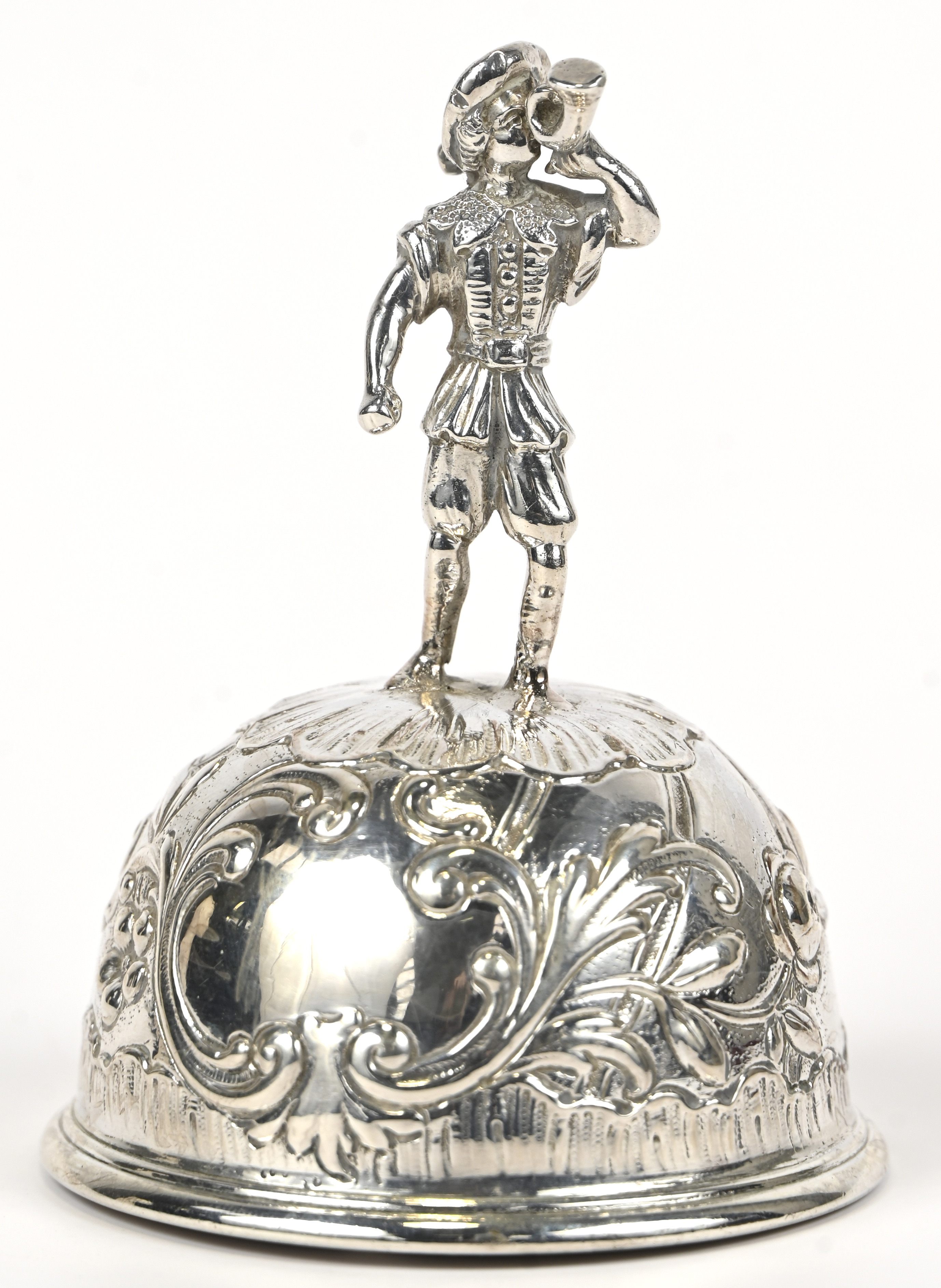 A silver table bell Handle in the shape of a man with a horn and with a rocaille motif. Unknown hallmarks. AR12. 120 g