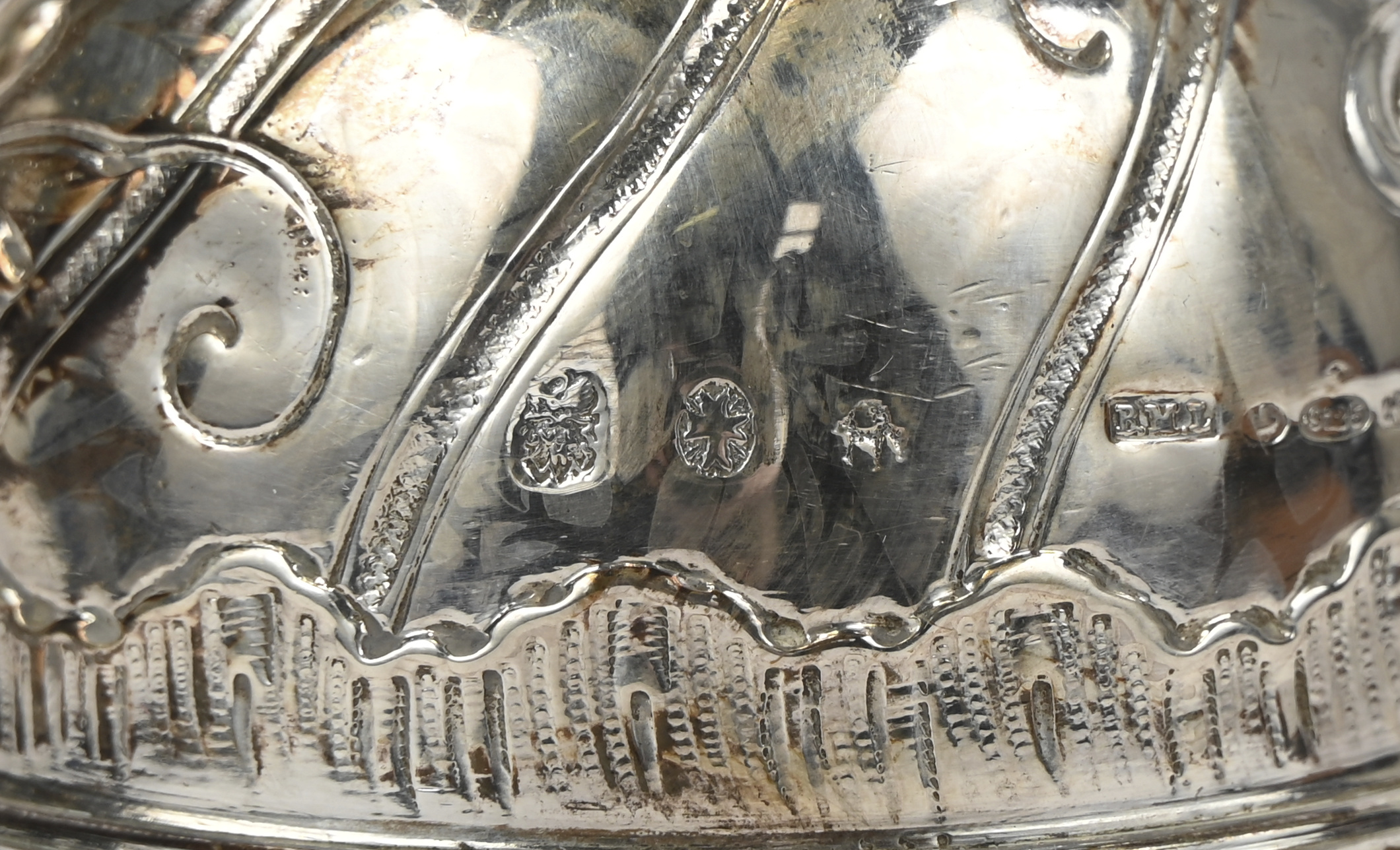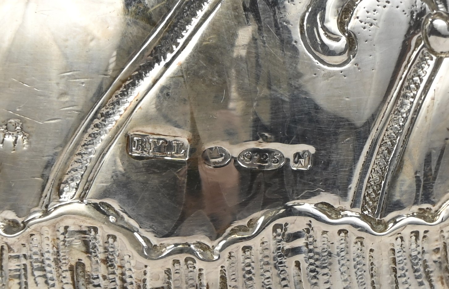 Een zilveren tafelbelletje Handvat in de vorm van een man met hoorn en met een rocaillemotief. Onbekende keuren. AR12. 120 g
