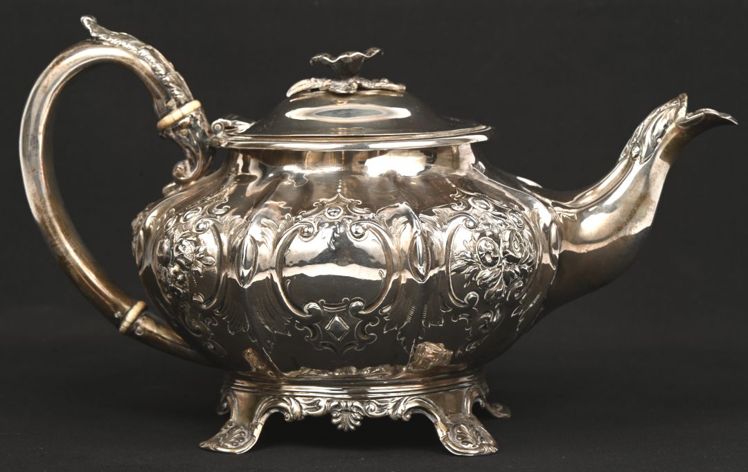 Een zilveren melkan en suikerpot met Londense keurmerken. Jaarletter K (1833), makersmerk van John & Henry Lias. Met een gezamelijk brutogewicht van 650 gram.