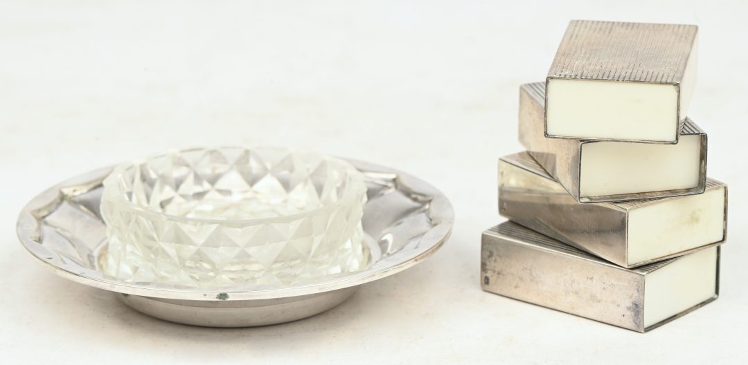 Een zoutvaatje van zilver en kristal, evenals vier luciferhouders van zilver met een gelijnd motief.