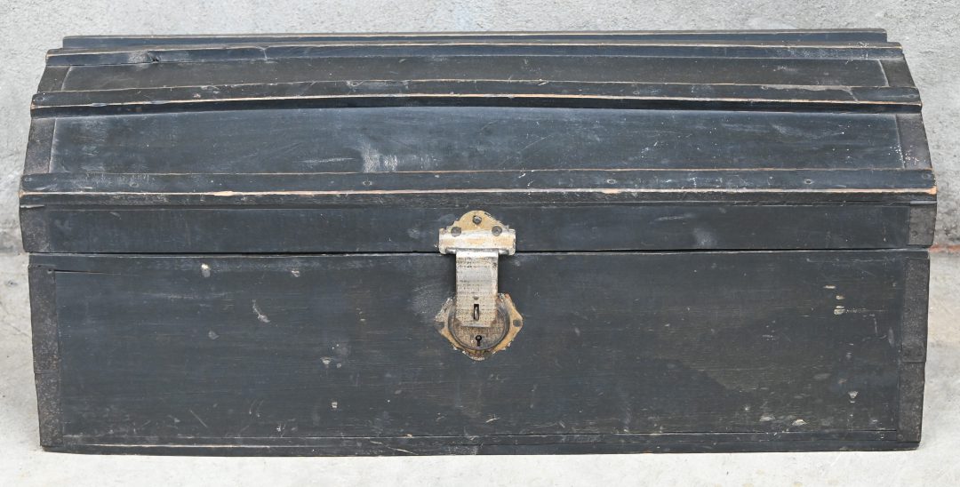 #77Een oud koperen dekselpotje gedecoreerd met guirlandes en een figuur.