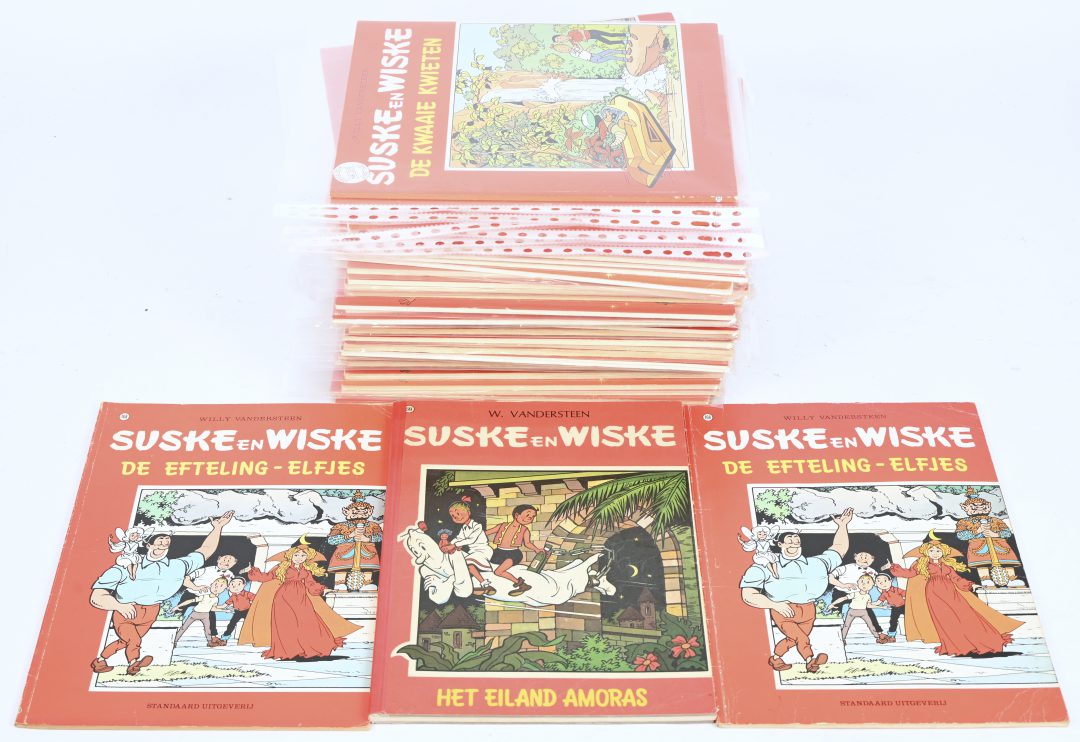 #207Vierentwintig stripalbums: Willy Vandersteen, Suske en Wiske, rode tweekleurenreeks (Ed. Standaard Boekhandel). “De Windmakers” (1963), De Gouden Cirkel” (1962), “De Wolkeneters” (2 x1965), “De Klankentapper” (1961), “De Kwakstralen” (1963, 1e ed.), “Het Rijmende Paard” (1963, 1e ed.), “De Sissende Sampam” (1963, 1e ed.), “Sjeik El Ro-Jenbiet” (2 x 1964, 1e ed. 1 in slechte staat, 1 x 1966), 1964), “De Tamtamklopper” (1964), “De Wilde Weldoener” (1964), “De Ijzeren Schelvis”, “De Schone Slaper”(..)
