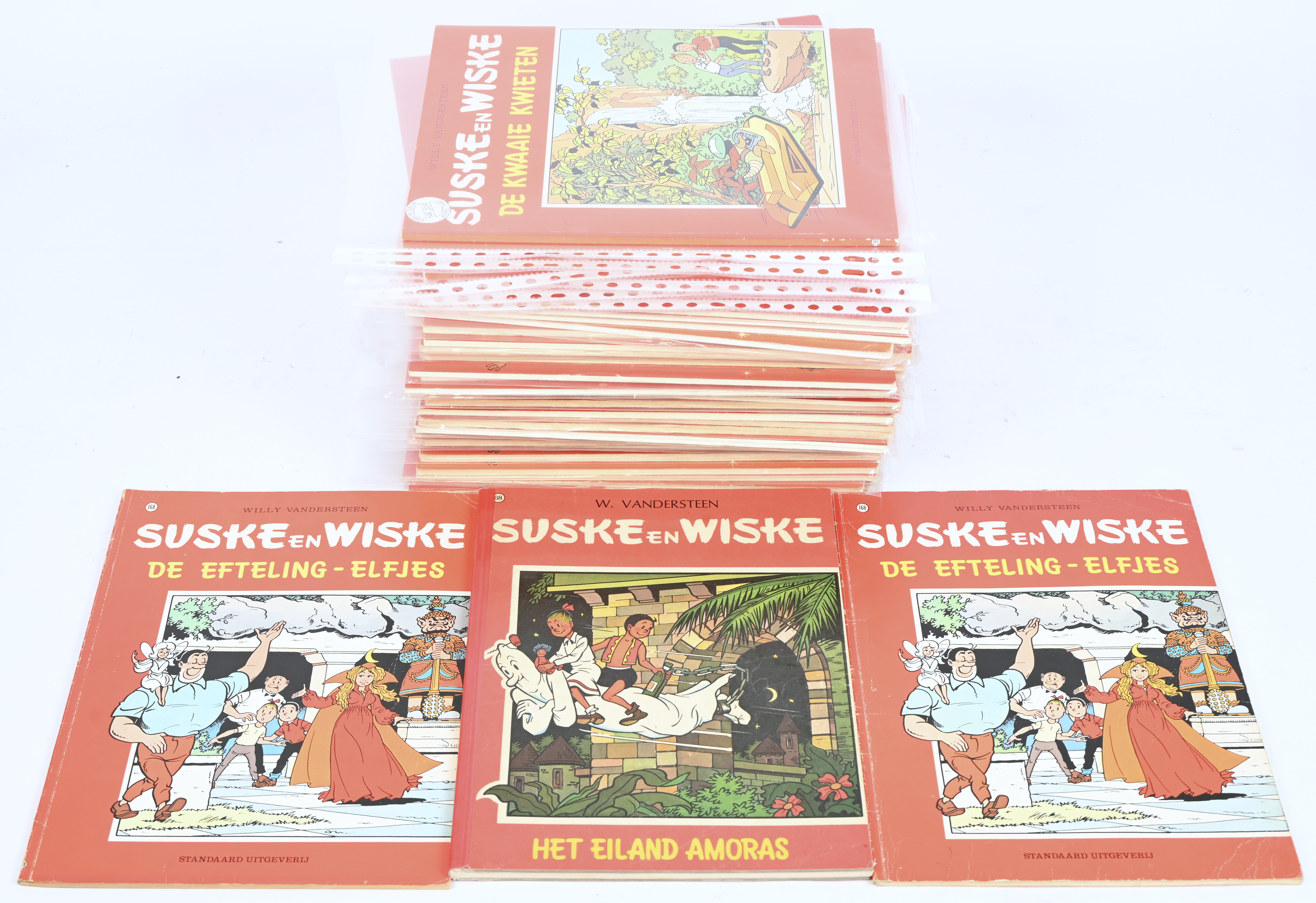 Twenty-four comic books: Willy Vandersteen, Suske en Wiske, red two-color series (Pub. Standaard Boekhandel). “The Windmakers” (1963), “The Golden Circle” (1962), “The Cloud Eaters” (2 x 1965), “The Sound Tapper” (1961), “The Quack Rays” (1963, 1st ed.), “The Rhyming Horse” (1963, 1st ed.), “The Hissing Sampam” (1963, 1st ed.), “Sheik El Ro-Jenbiet” (2 x 1964, 1st ed. 1 in poor condition, 1 x 1966), 1964), “The Drum Beater” (1964), “The Wild Benefactor” (1964), “The Iron Haddock”, “The Sleeping (..)Place a bid ›Estimate: € 100 / 140 -