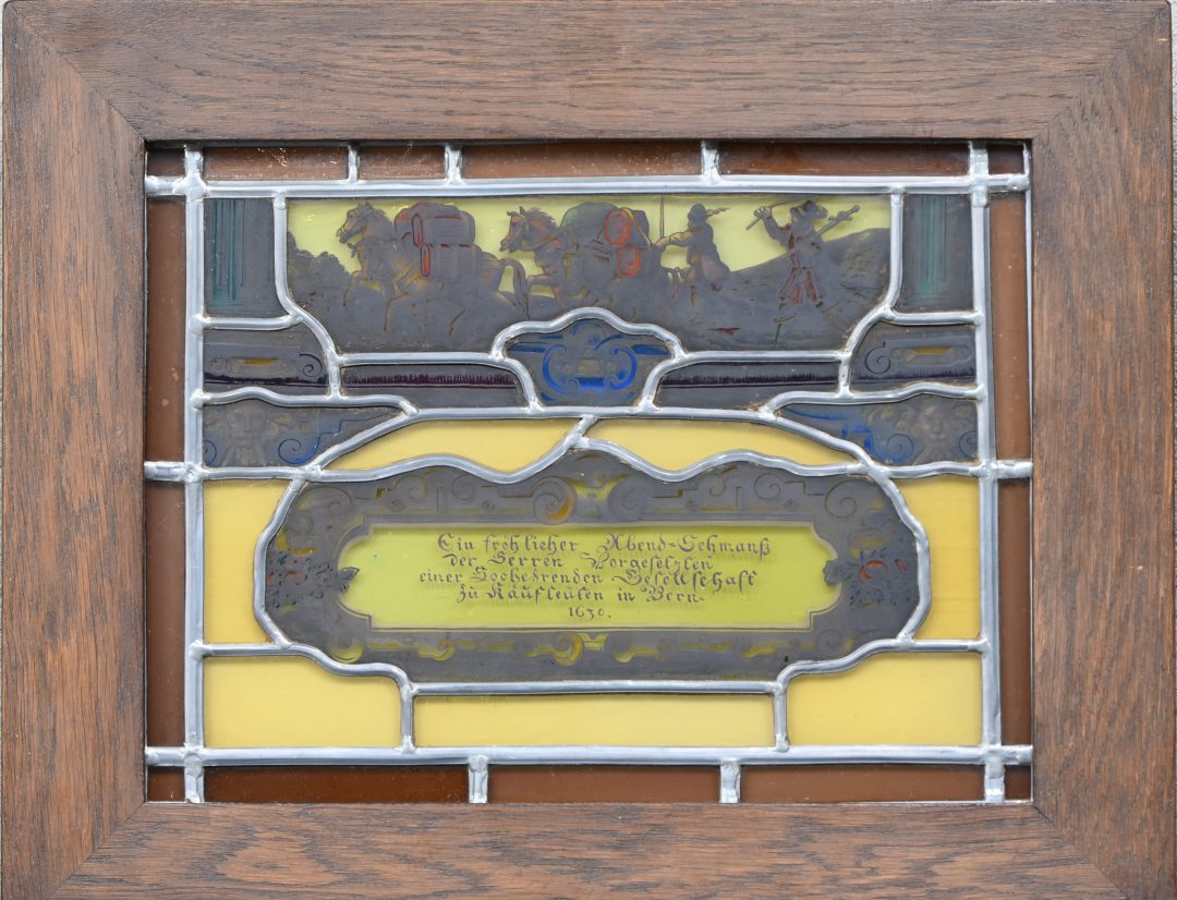 “Ein fröhllicher Abend-Schmanss der Serren vorgesezten einer Lochesrenden Gesellschaft zu Käuflauten in Bern 1630”. Een klein glasraam gemonteerd in een lichtbak.