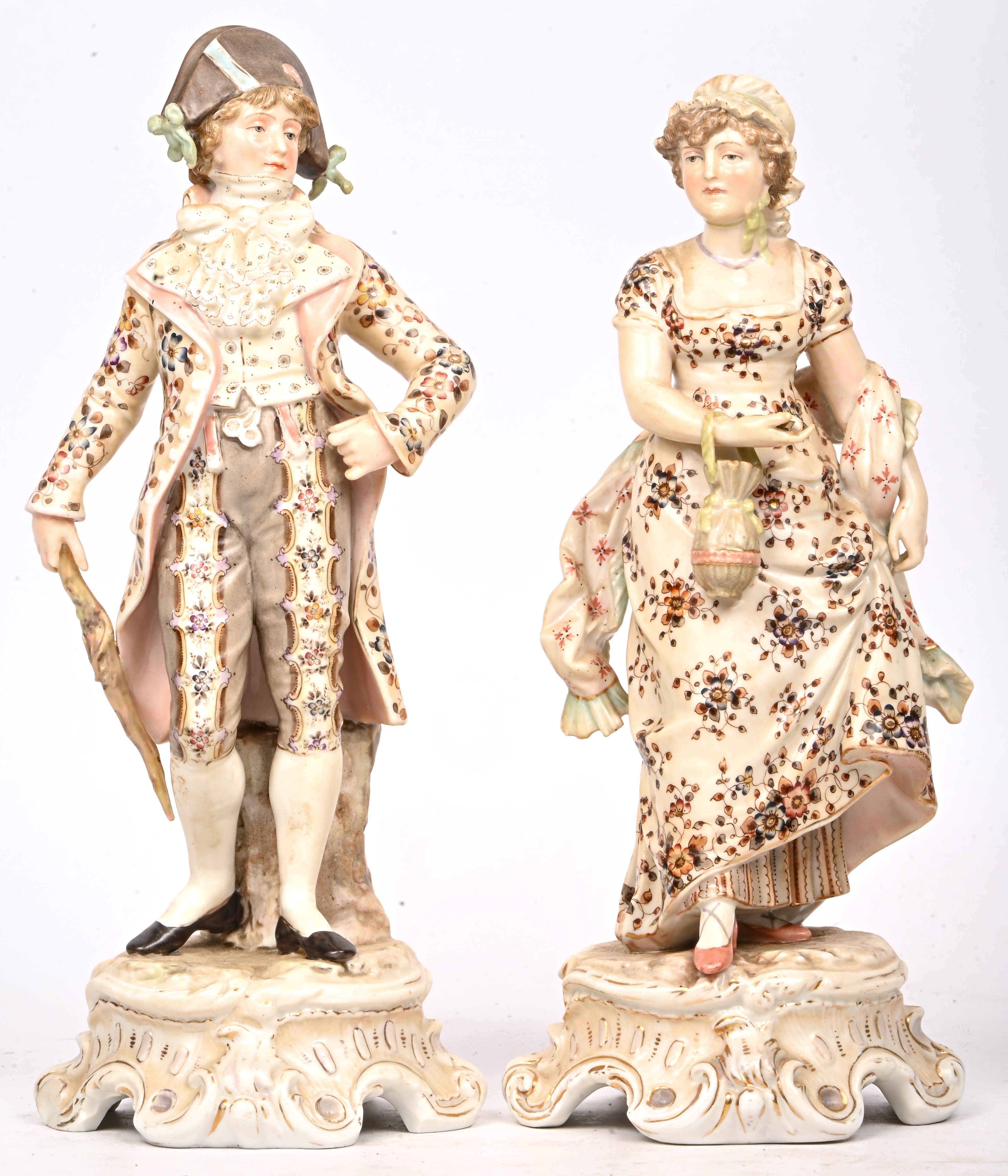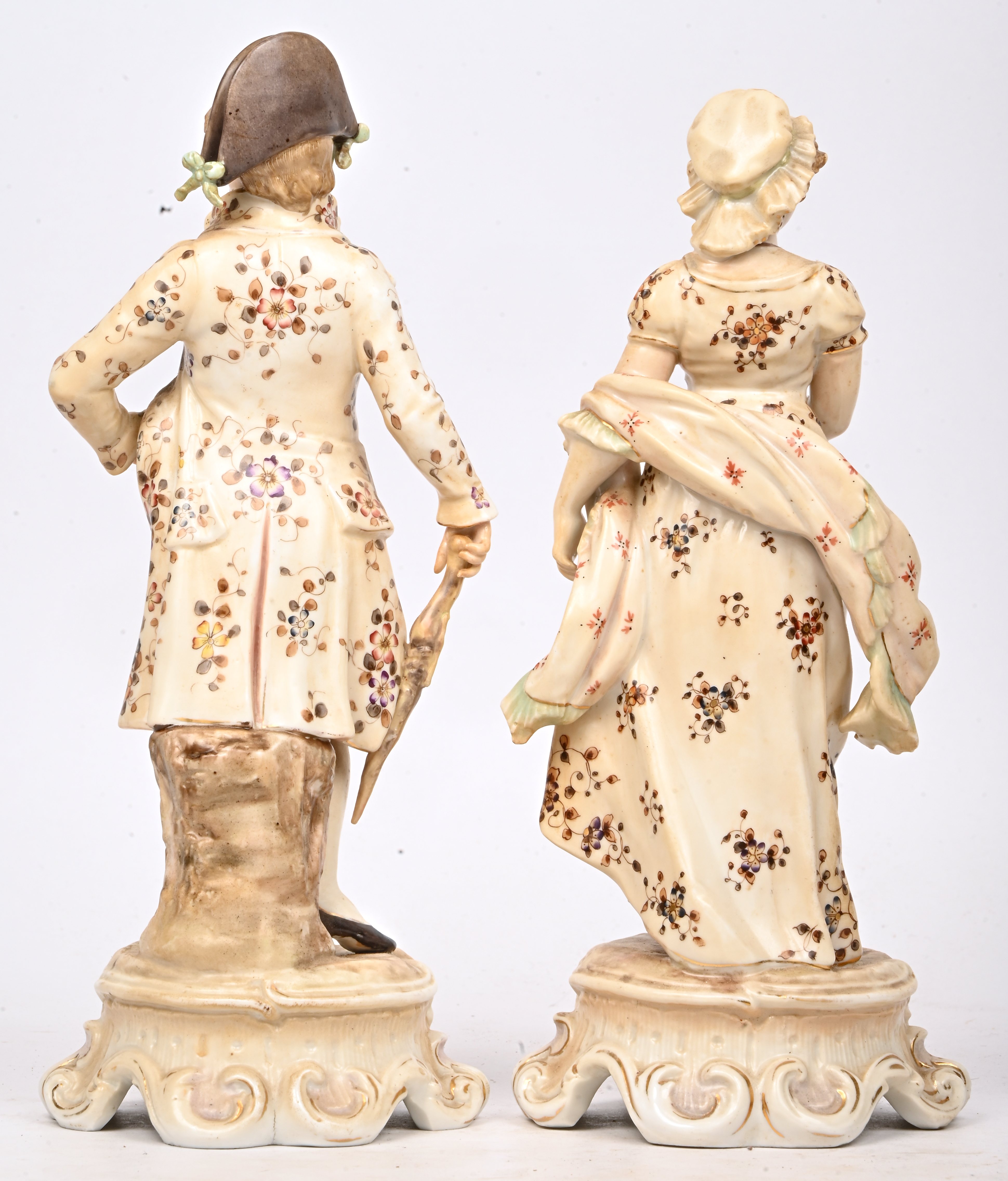 A musical couple in polychrome porcelain. Marked with crossed swords underneath, probably Meissen. Small damages. -