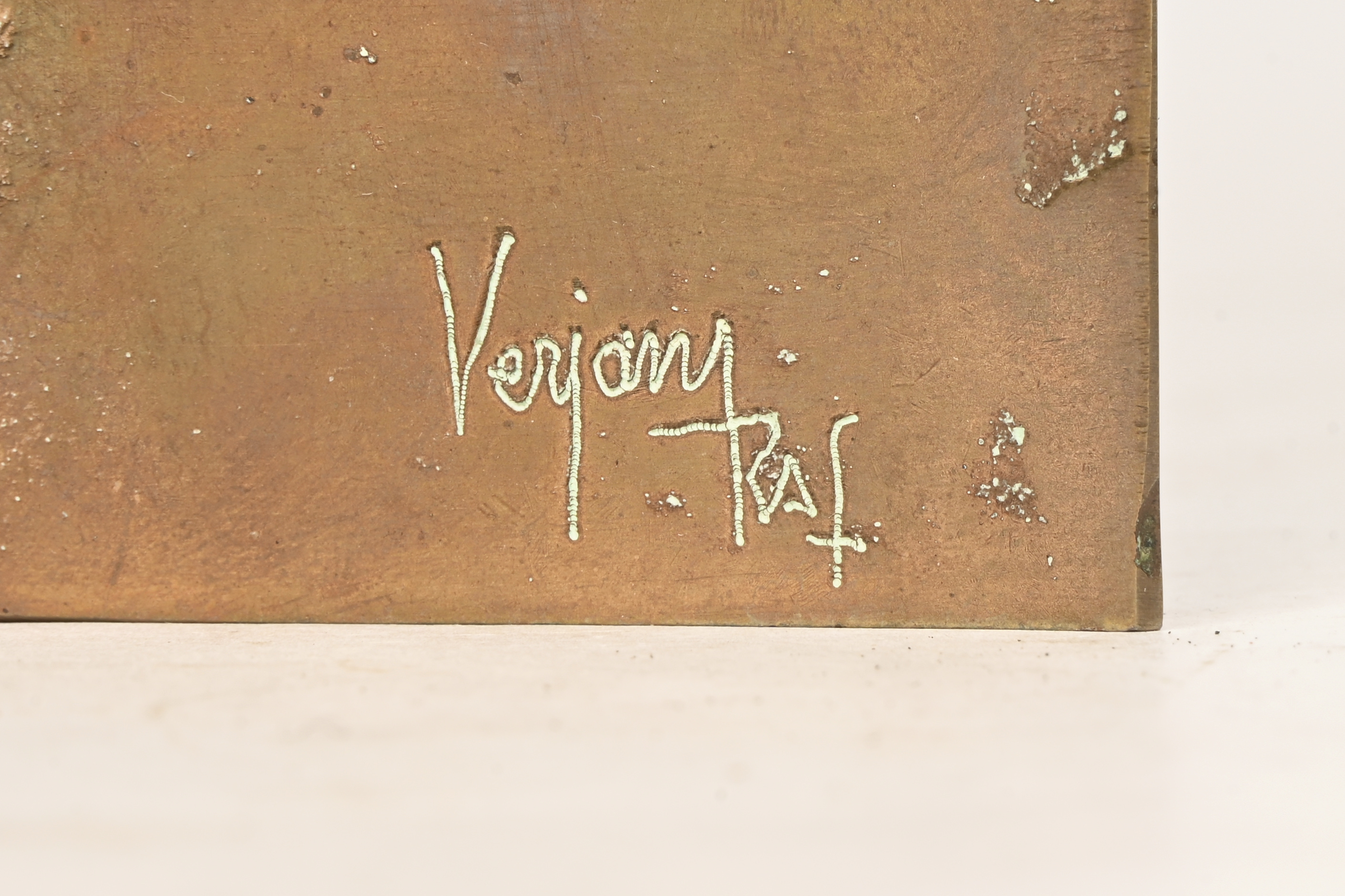 "The Lovers," a terracotta bas-relief, signed by May Claerhout. -