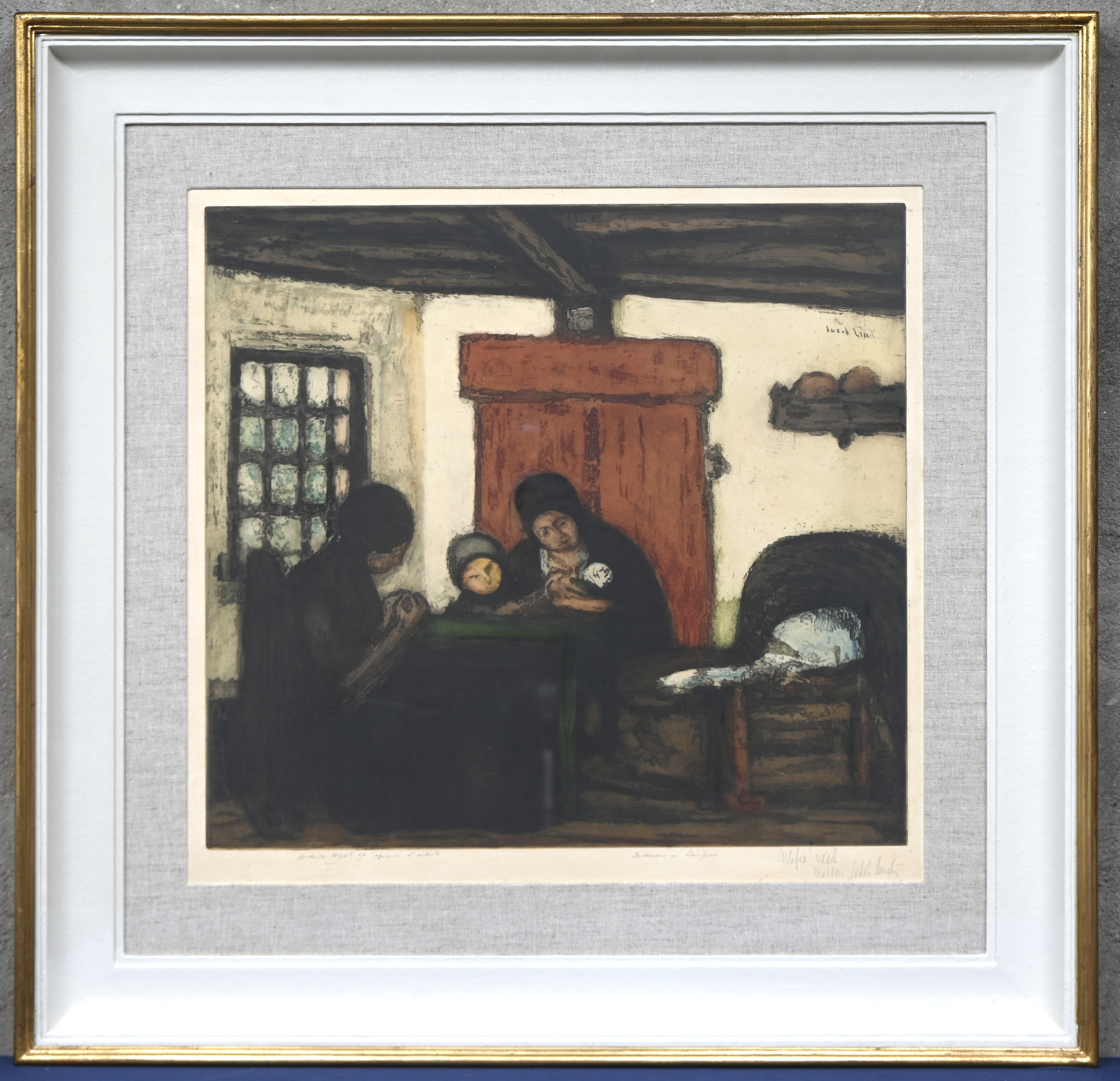 “Family in an Interior.” A color etching. Signed by the widow of Jakob Smits.