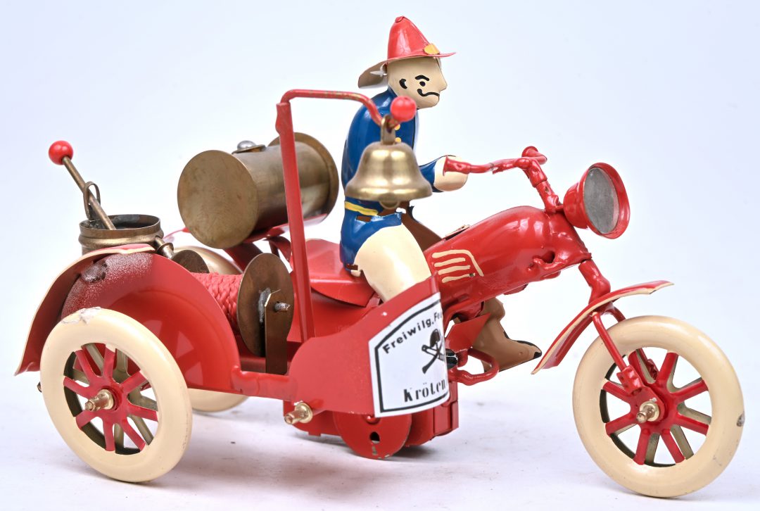 ‘Feuerwehr mit Anhänger’ is a wind-up tin fire truck with a trailer. Model T-182, number 54 out of an edition of 400 copies. -