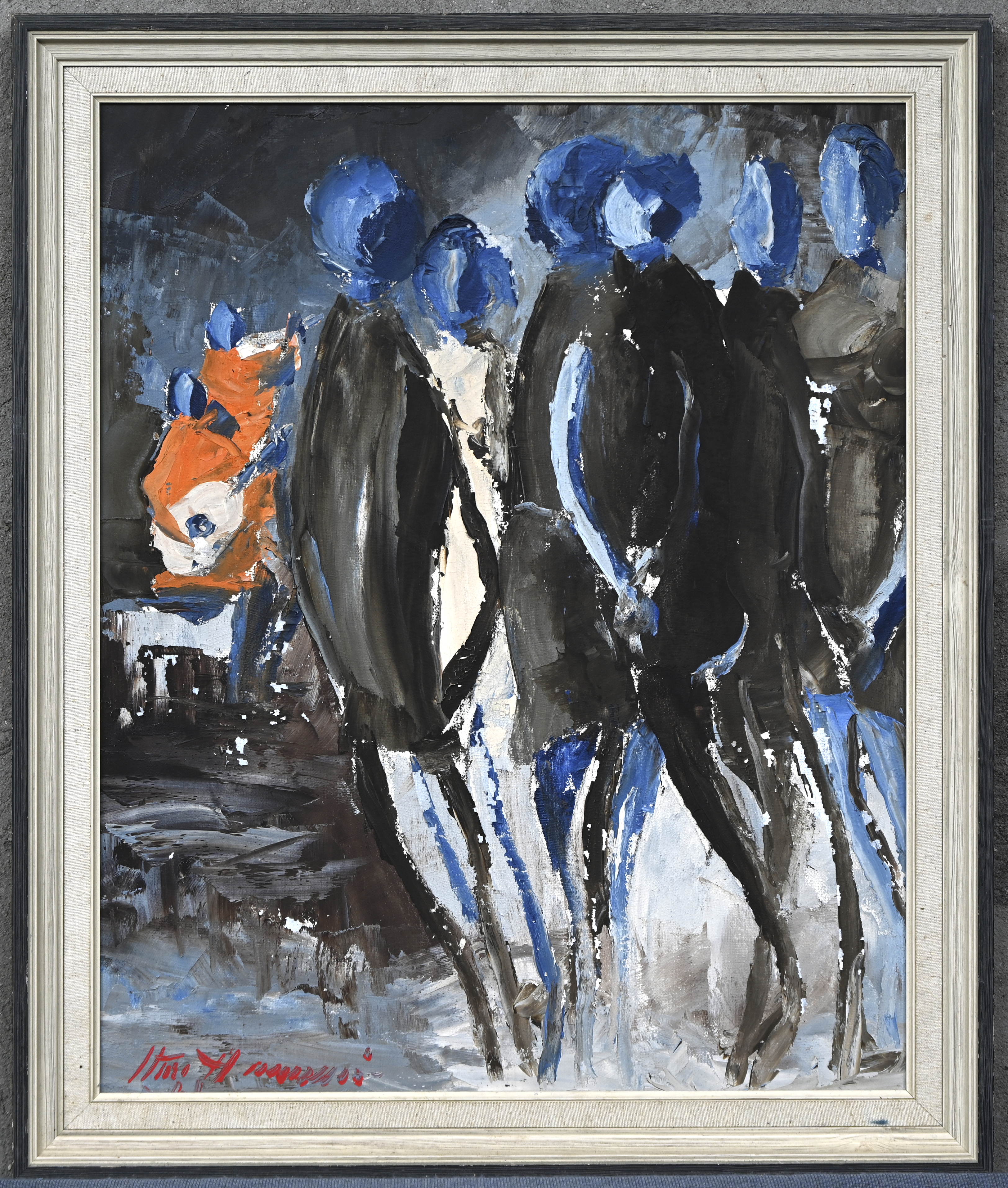 “Figuratief abstract”. Een schilderij, olieverf op paneel. Onderaan gesigneerd.