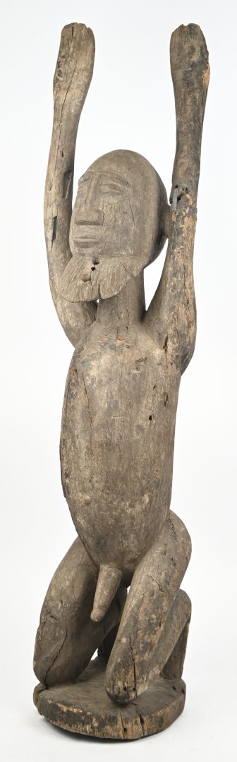 “Gebed om regen”. Een houten vorouderbeeld van een knielende man met baard, de handen ten hemel geheven. Dogon, Nigervlakte.