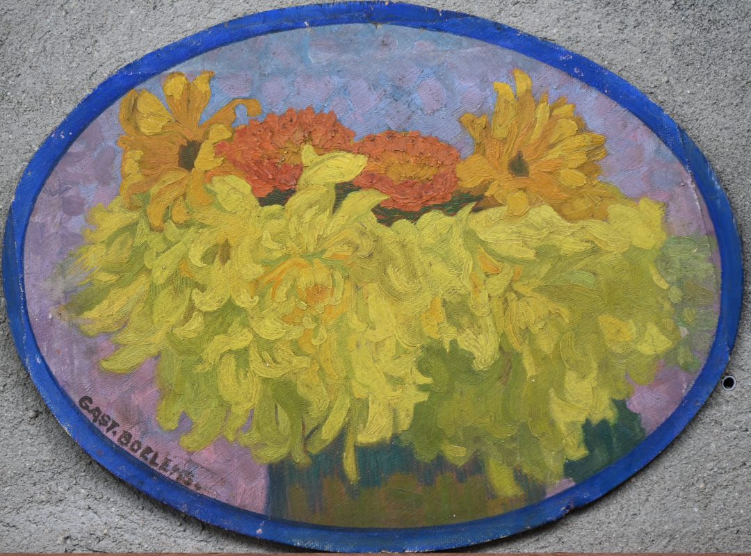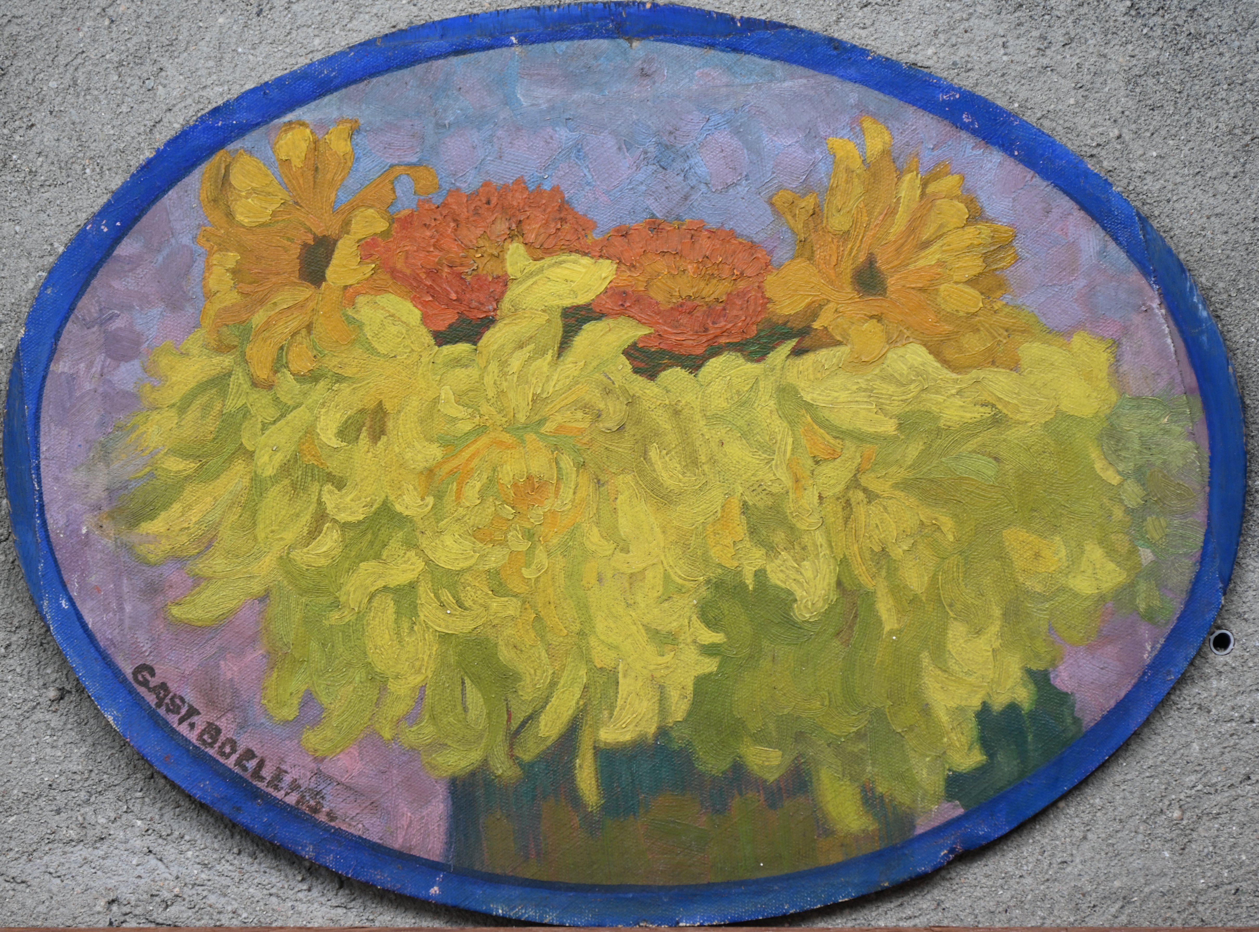 'Yellow dahlias', oil on oval painter's panel. Signed Gast. Boelens.