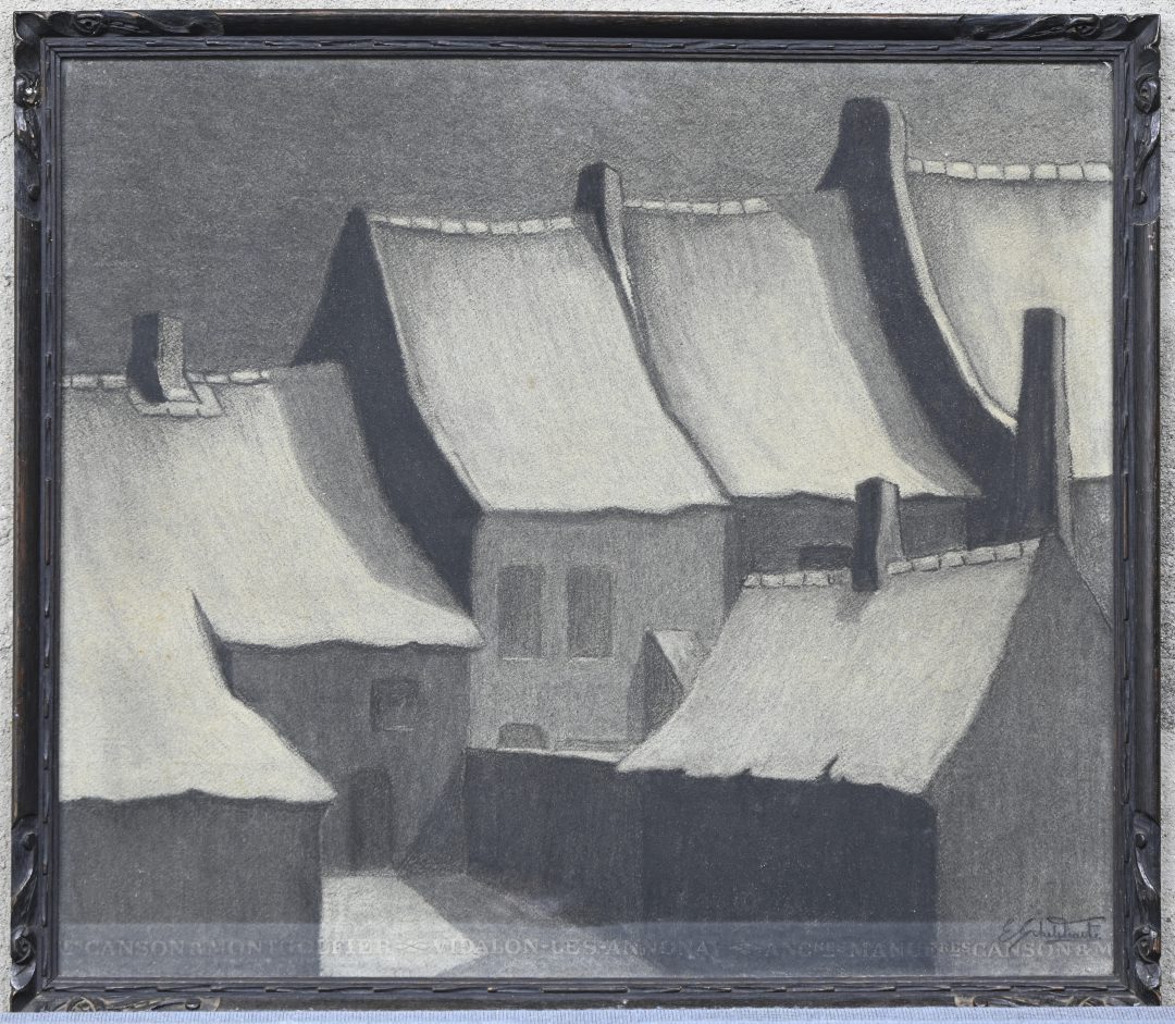 #212Edmond Verstraeten‘Sneeuwlandschap met hooimijten’, krijttekening op papier. Gemonogrameerd E. V.