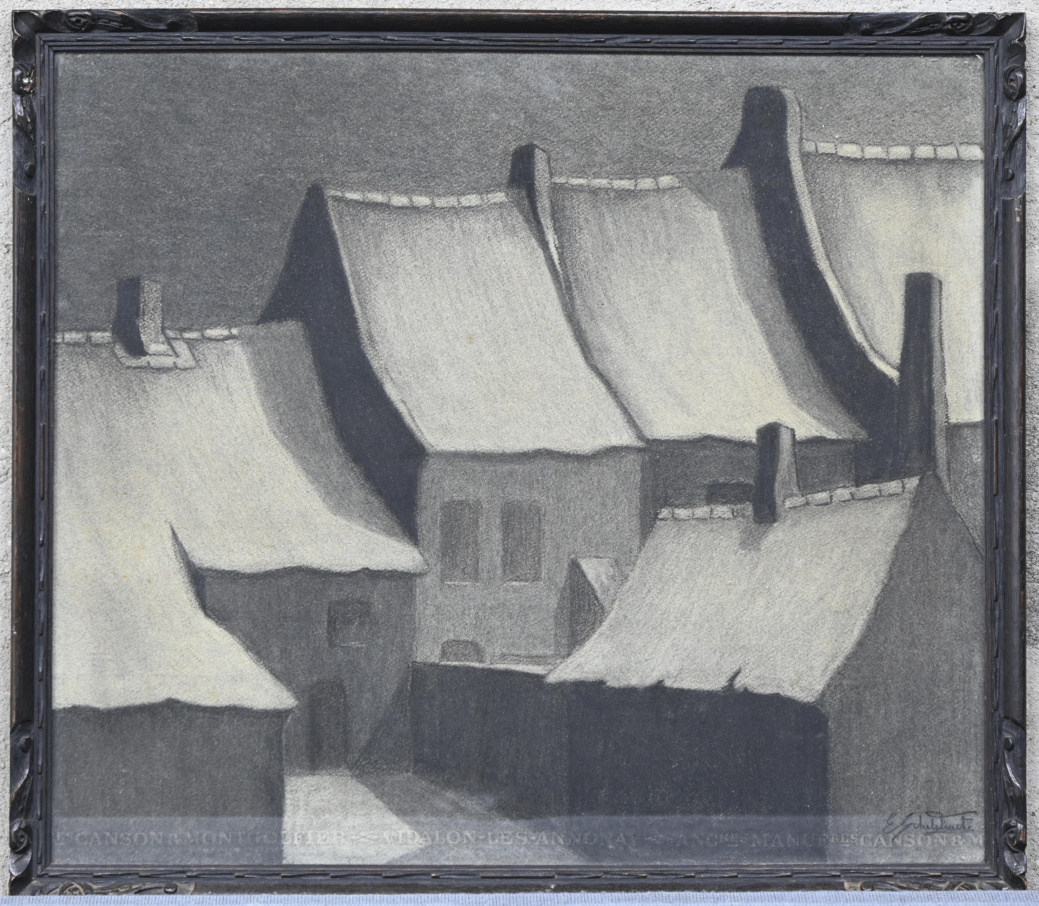'Snowscape with Haystacks', chalk drawing on paper. Monogrammed E. V. -