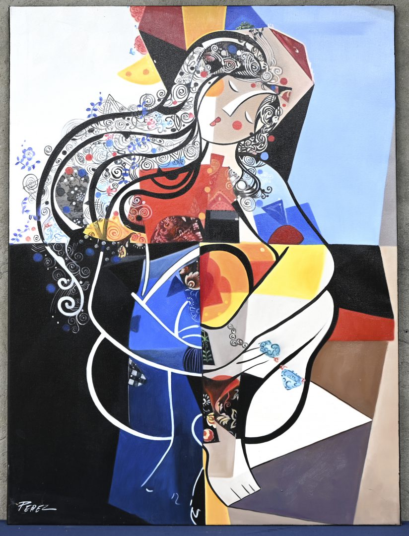 "Stylized woman with veil". Oil on canvas. Signed. Restoration to the top left.