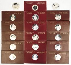 "The Masterpieces of Rubens". Ed. Franklin Mint. On the occasion of the Rubens Year 1977. Sterling silver, 925/1000 Proof, each medal weighs 31.1 g. 18 pieces each in a presentation card. -