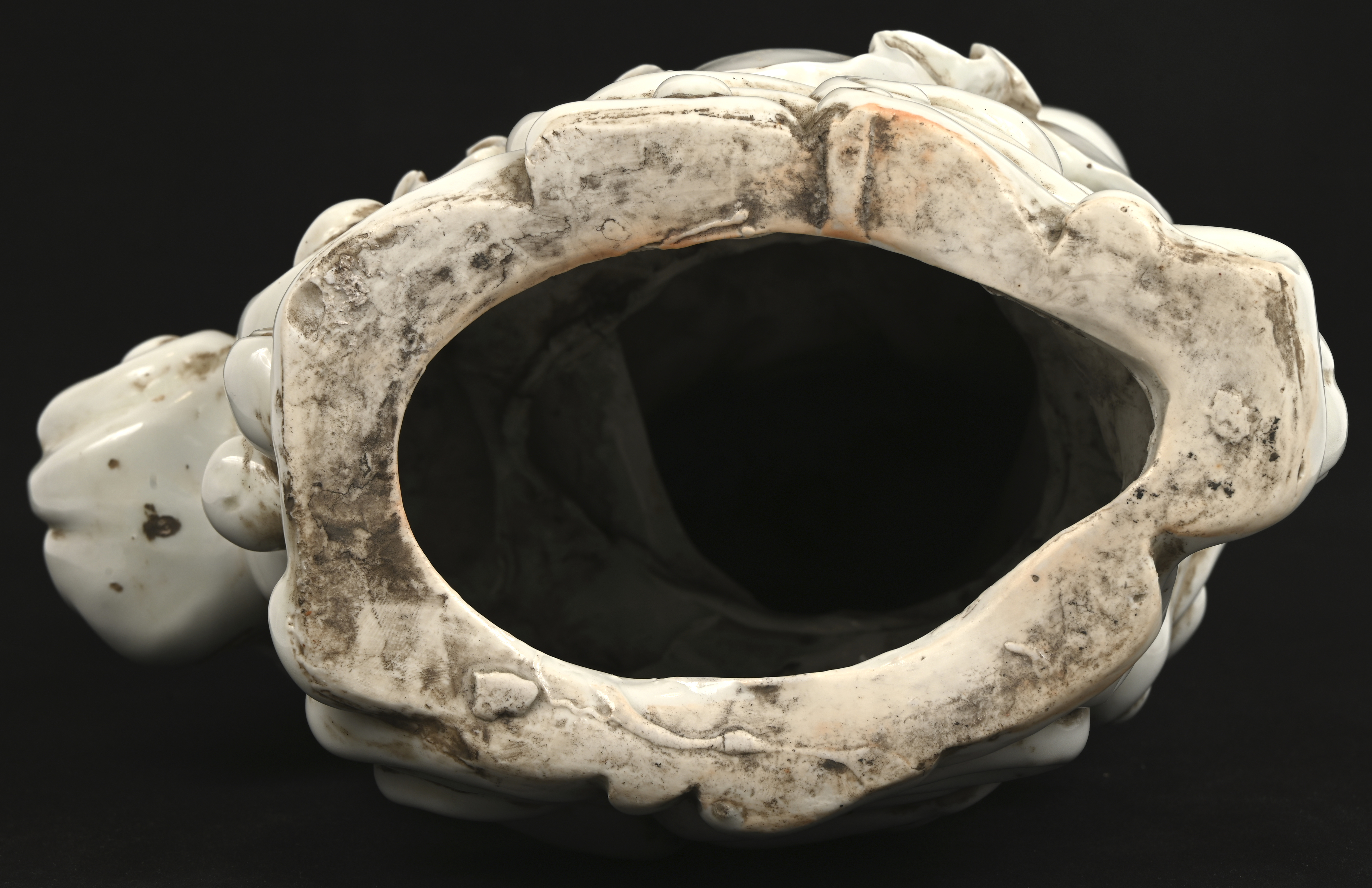 #27Een hoorn des overvloeds uit brons en porselein, met mythologische figuren gedecoreerd, gemerkt.