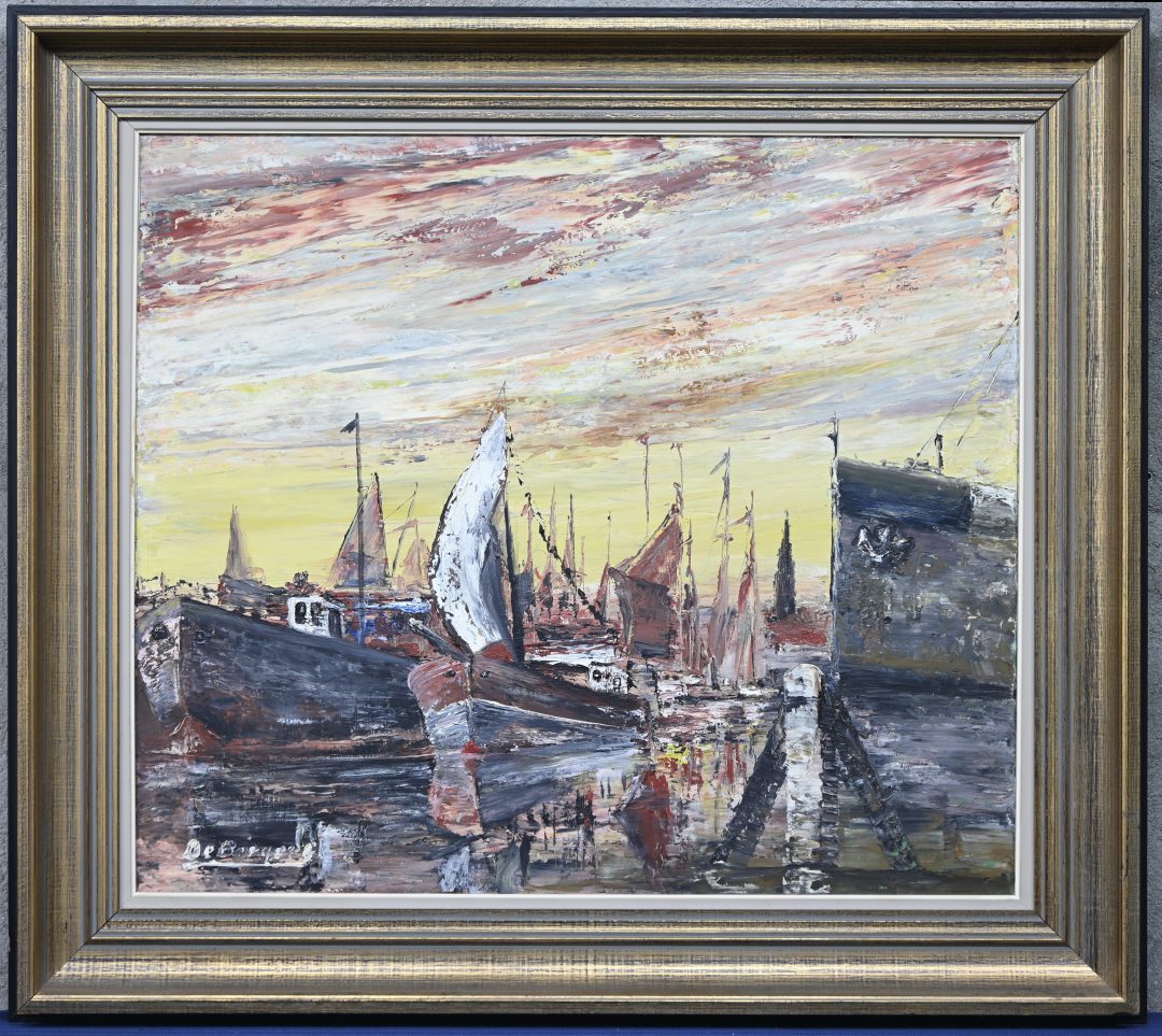 #524Pauwaert‘Platbodems onder zeil’. Olieverf op papier. Getekend.