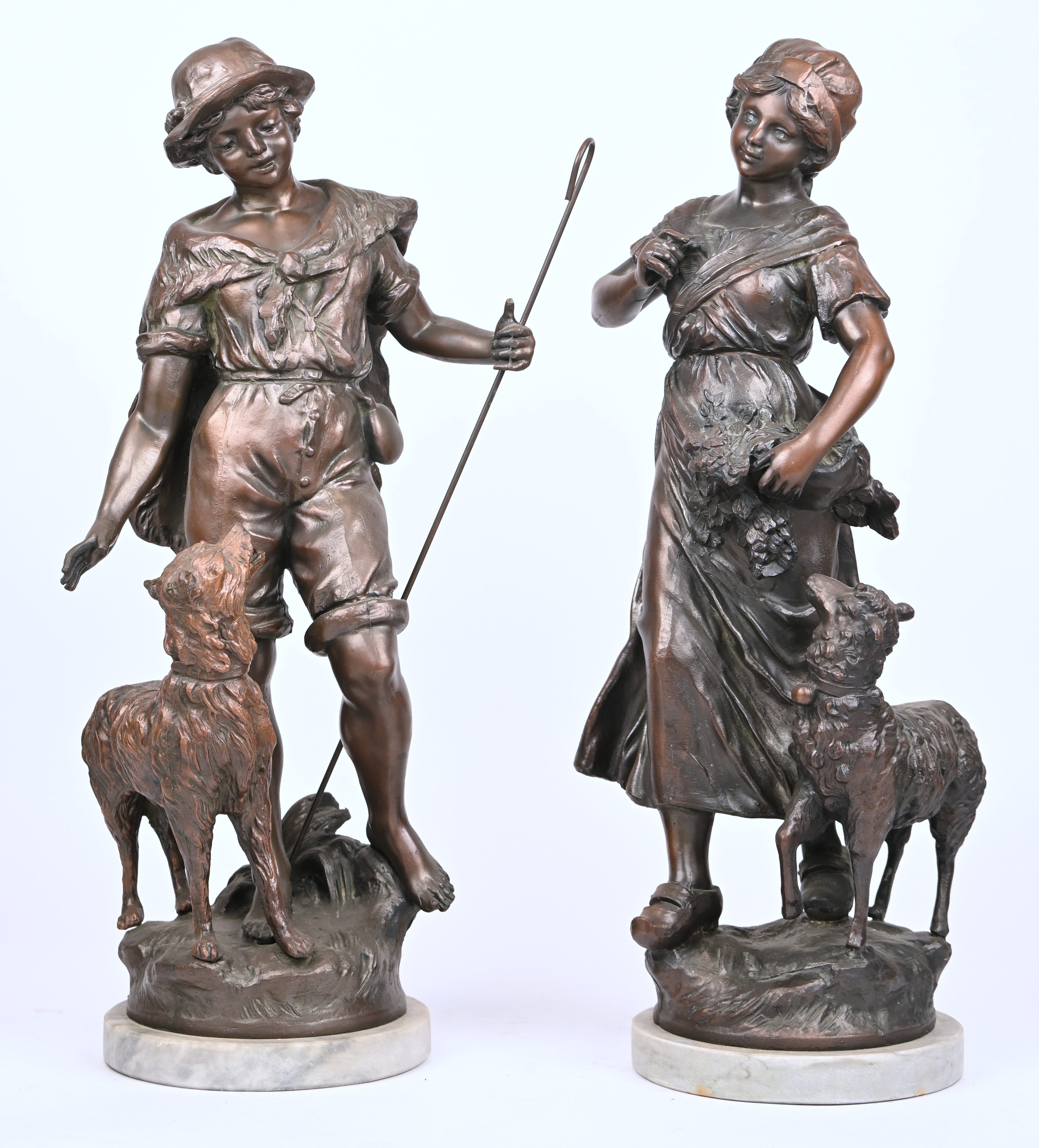 “Herderskoppel”, een set van 2 zamakken beelden op marmeren voetstuk.