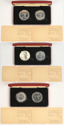 Three cases each containing a coin of 5 and one of 2.50 Zaire from 1975. Ag 925/1000, weighing 35 g and 28.28 g respectively. Ed. Royal Mint for the Banque du Zaire. -