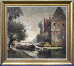 #62Alfred Van NestePeriod: 1874 - 1969“Aan het water”, een schilderij, olieverf op doek in vergulde kader, gesigneerd.