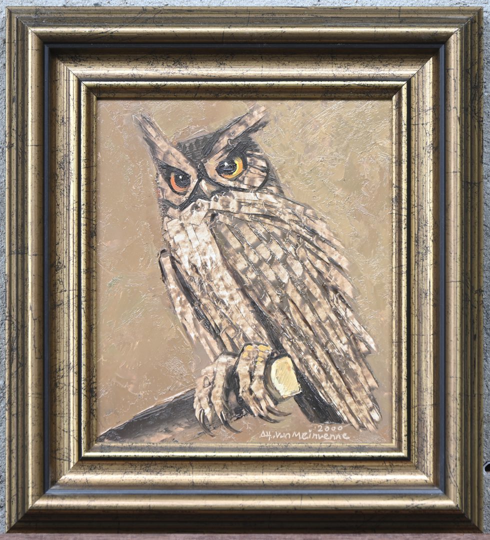 #474Alfons Van MeirvennePeriod: 1932 - ....“Hibou”, een schilderij, olieverf op paneel, gesigneerd en gedateerd 2000.
