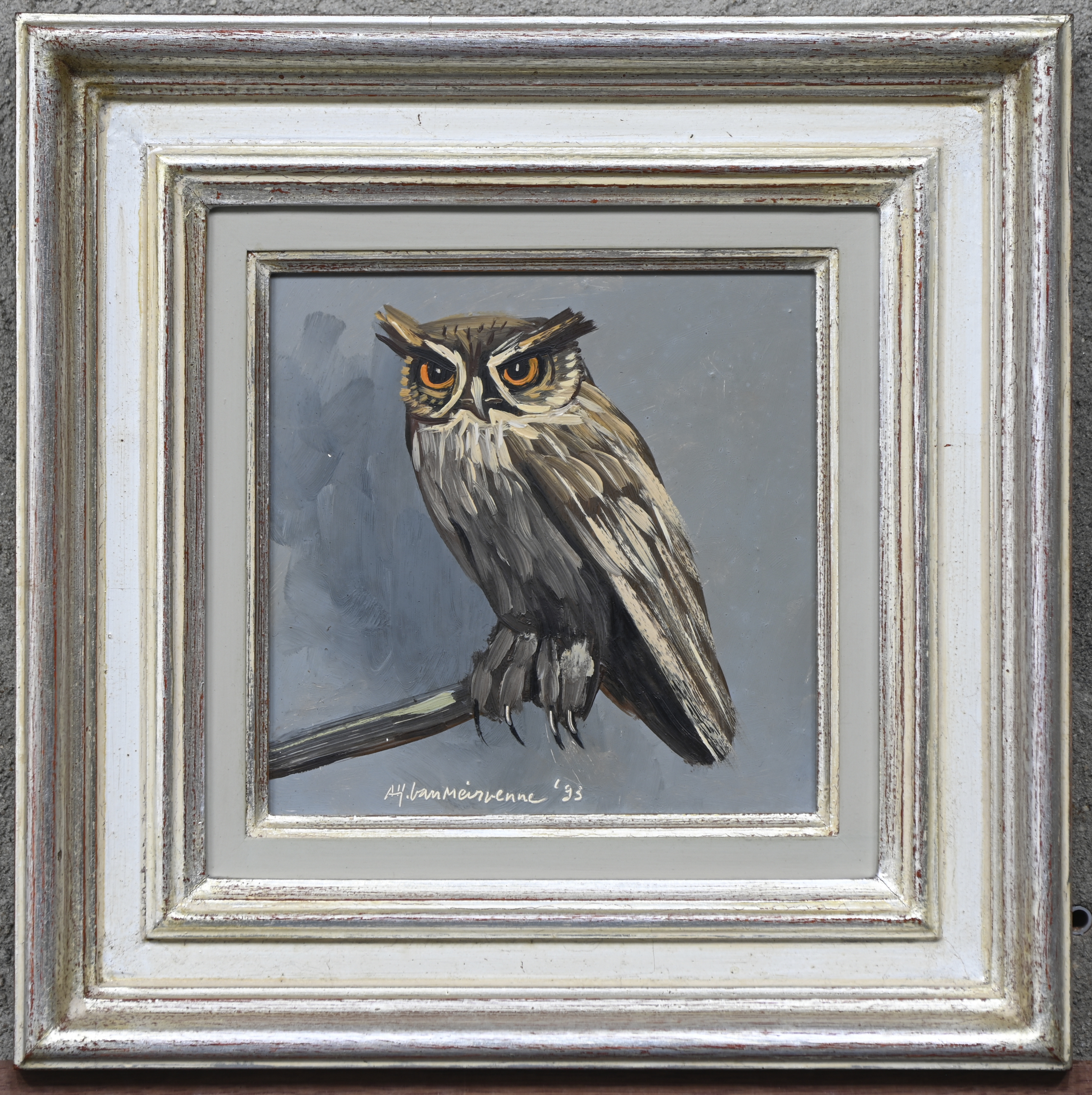 #484Alfons Van MeirvennePeriod: 1932 - ....“Hibou”, een schilderij, olieverf op paneel, gesigneerd en gedateerd ‘93.