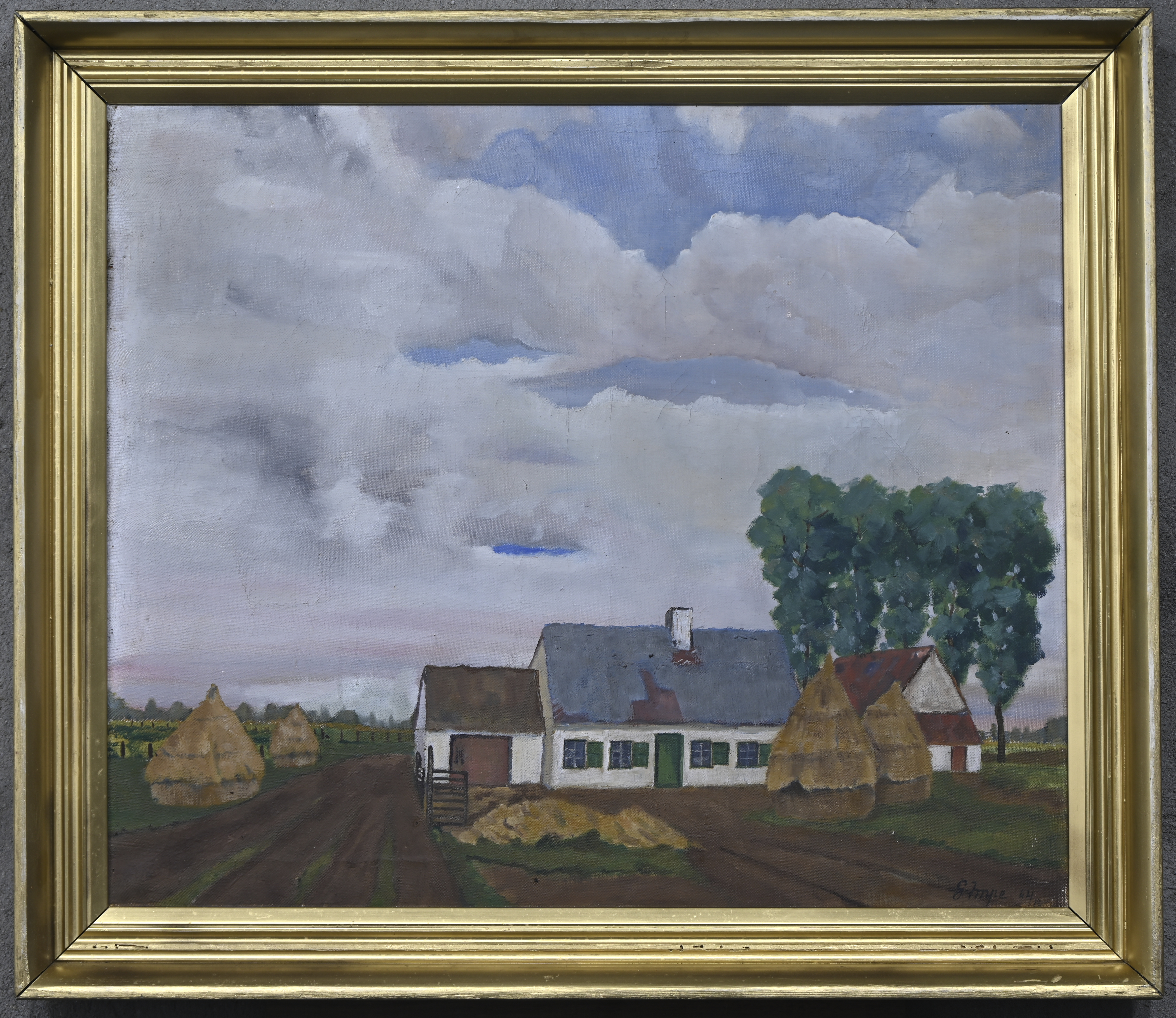 ‘Farmstead with haystacks’. Oil on canvas, signed; G. Impe, ’44.