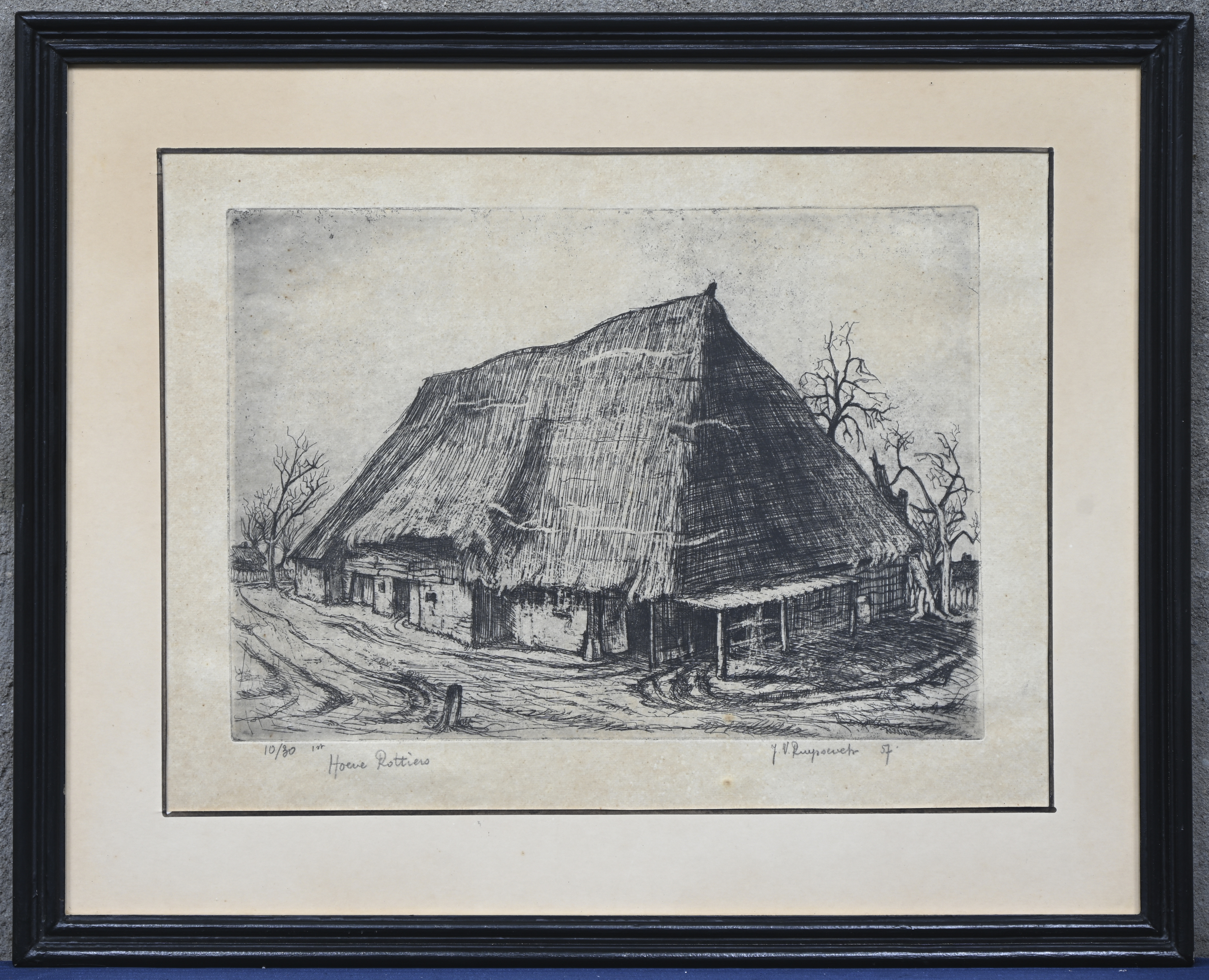 ‘Hoeve Rottiers’, een monochrome ets, 1ste staat. Getekend J.V. Ruyssevelt ‘57.