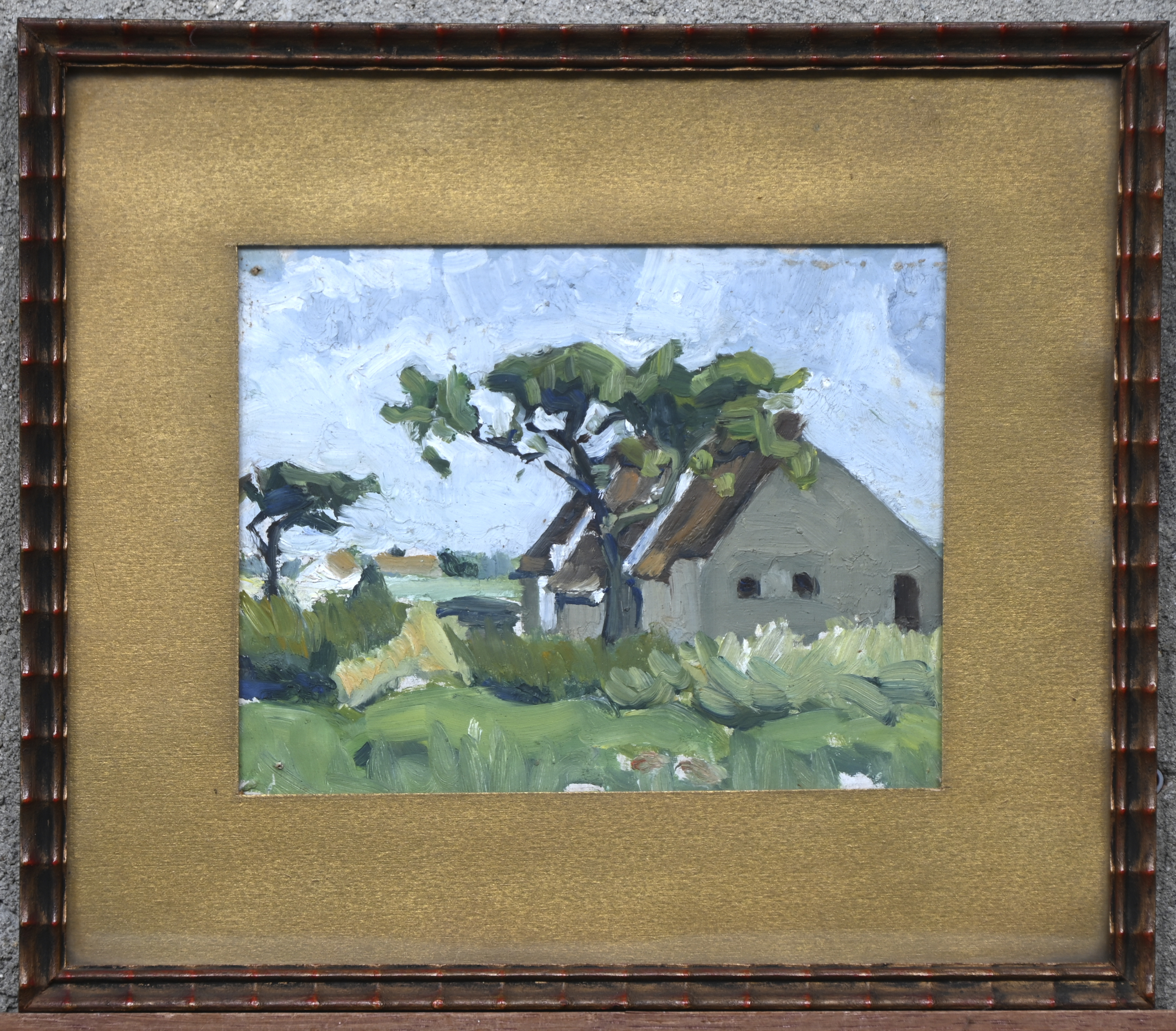 "Farm View", a painting, oil on board, not signed.
