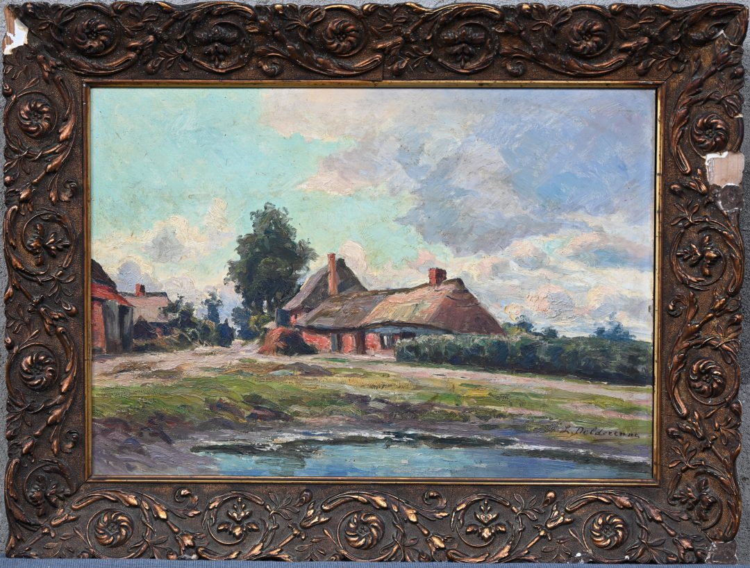 "Farm view". A painting, oil on panel, signed L. Delderenne. Damaged frame.