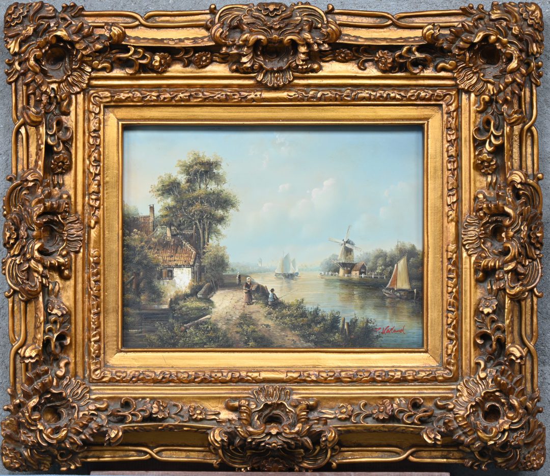 "Dutch landscape with windmill and flat-bottomed boats," a painting, oil on panel in a gilded frame. Dating to the 19th century.