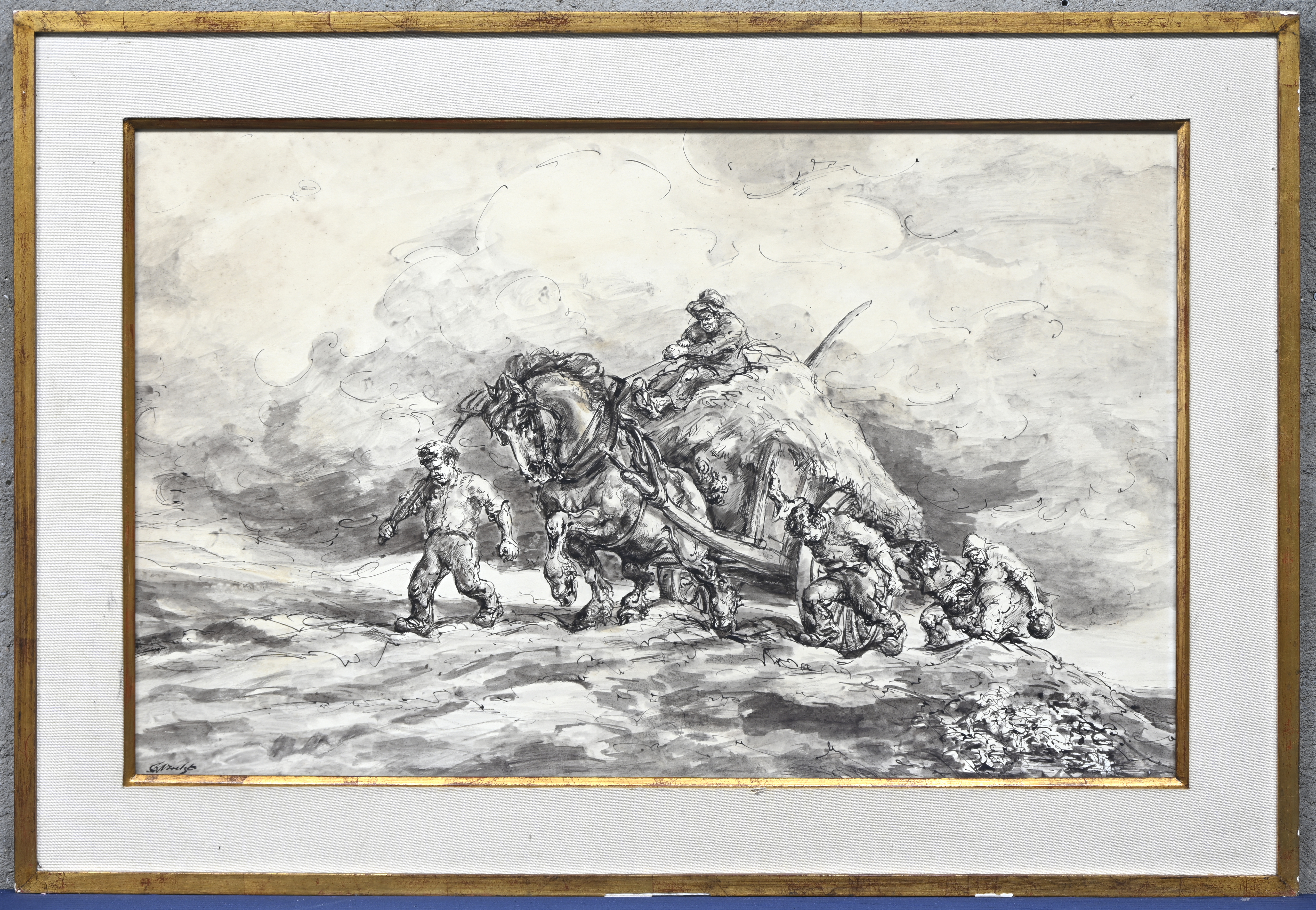 “Hay Wagon,” a washed ink drawing in the style of Alfred Ost. Illegibly signed.