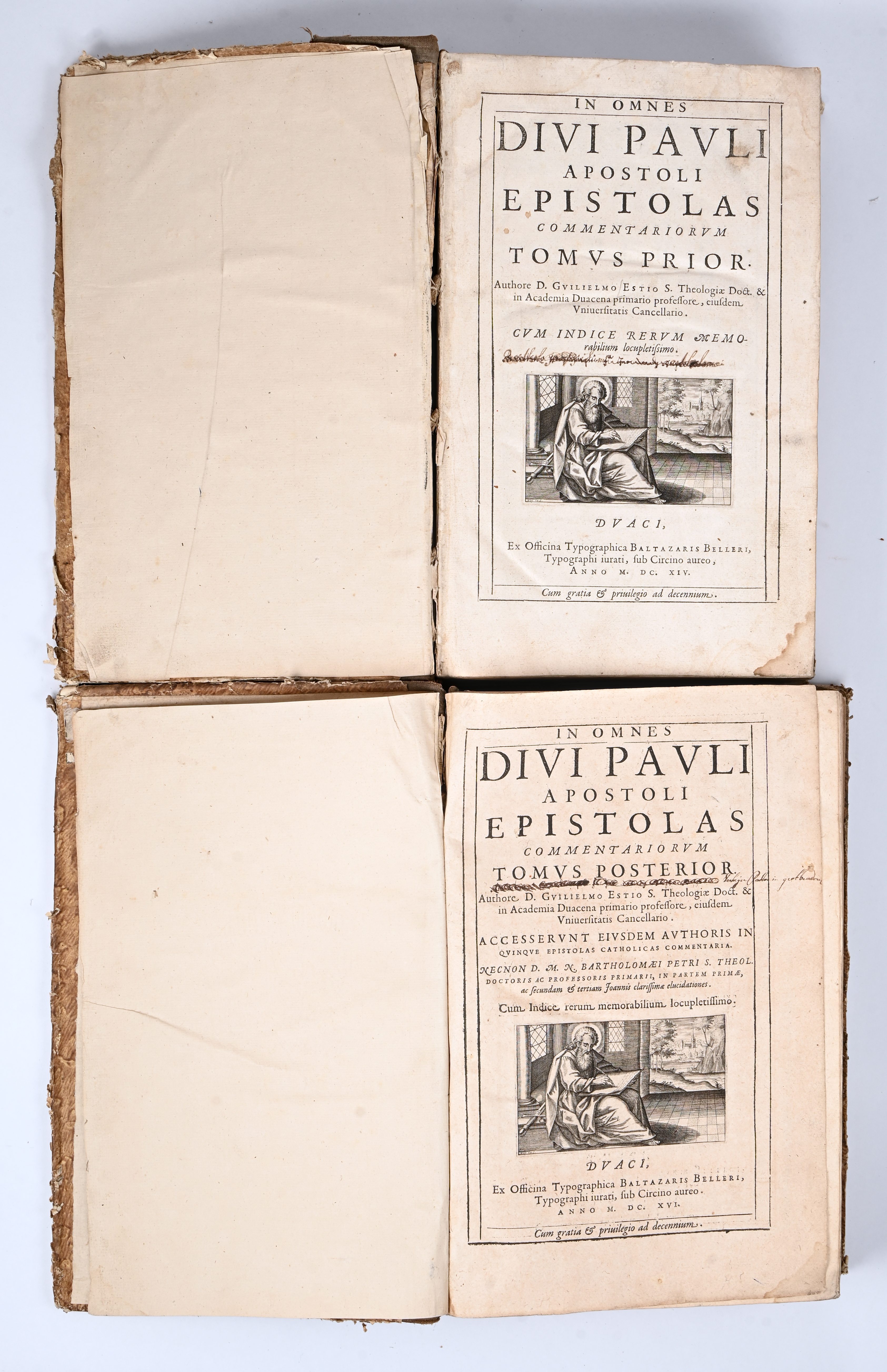 In omnes Divi Pauli Apostoli Epistolas Commentariorum Tomus Prior & Posterior. Officina typographica Baltazaris Belleri 1616. vol, in-f°. Omslag in slechte staat.