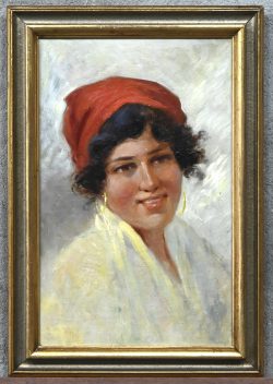 #217“Portret van een jonge zigeunerin”, een schilderij, olieverf op doek, medio vorige eeuw, niet gesigneerd.