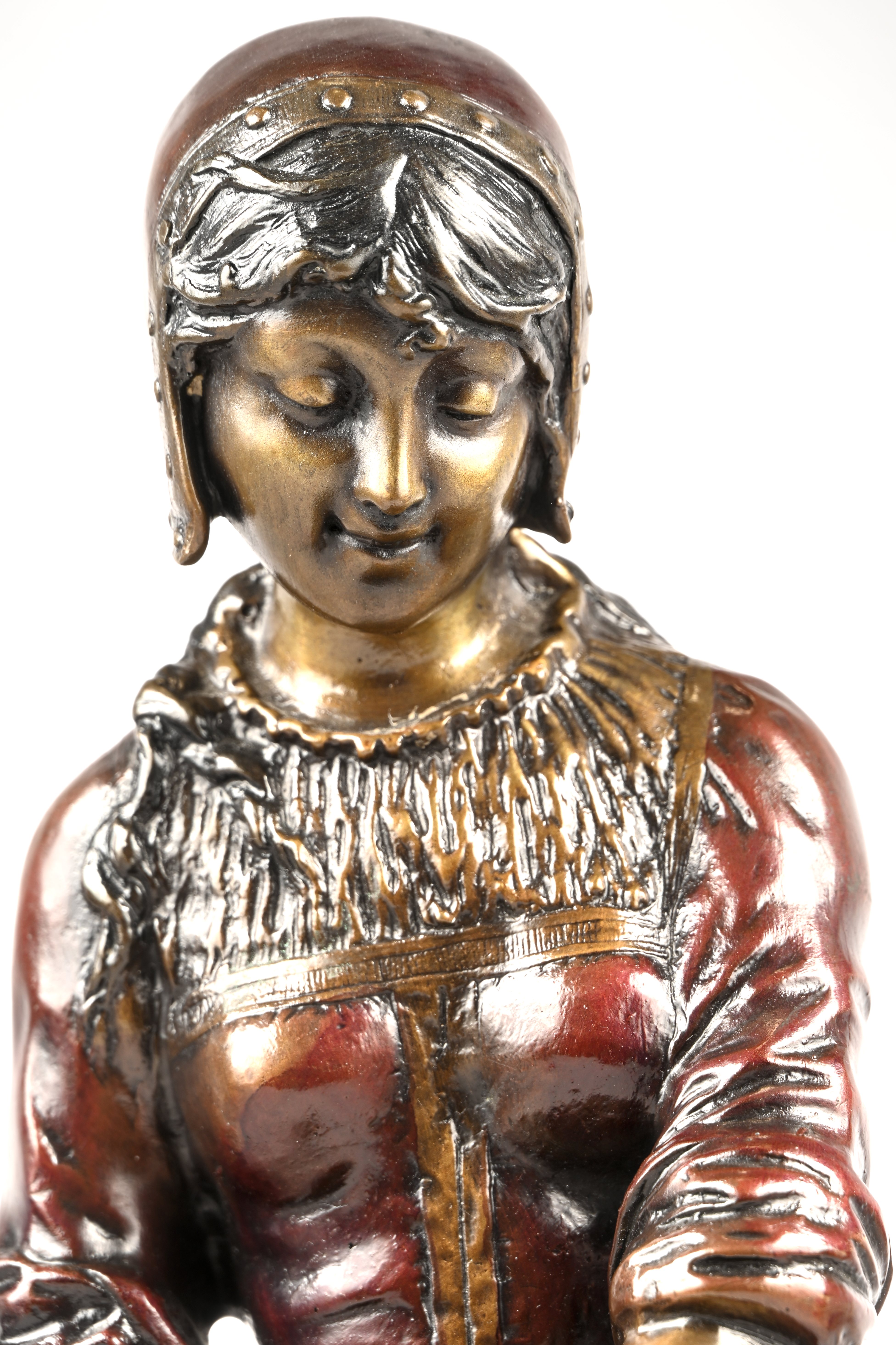 ‘Edeldame met verenhoed’, een buste van gepatinneerd brons. Getekend R. Gregoire.