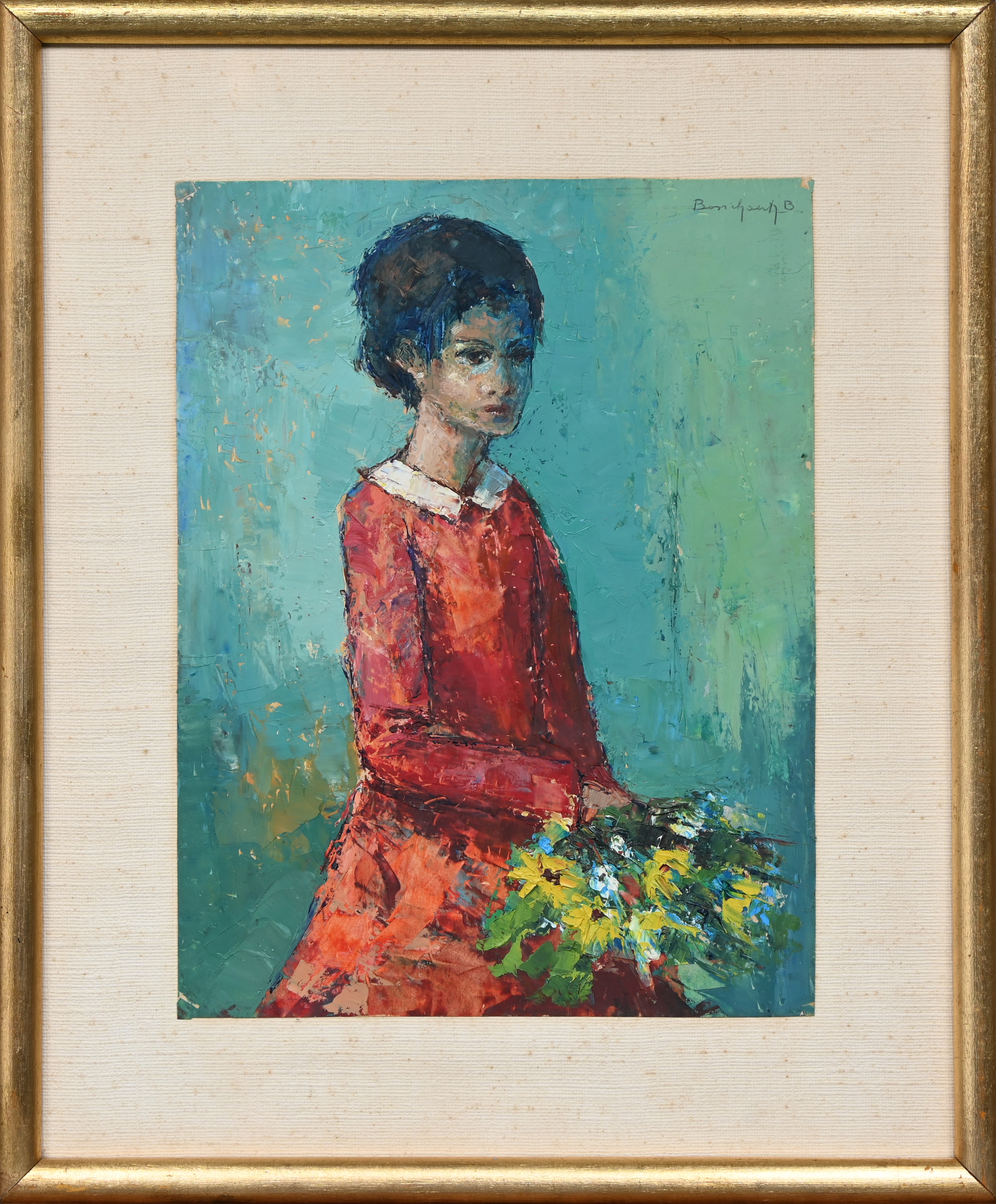 ‘Jonge vrouw met een bos bloemen’, olieverf op papier. Getekend Bosschaert B.