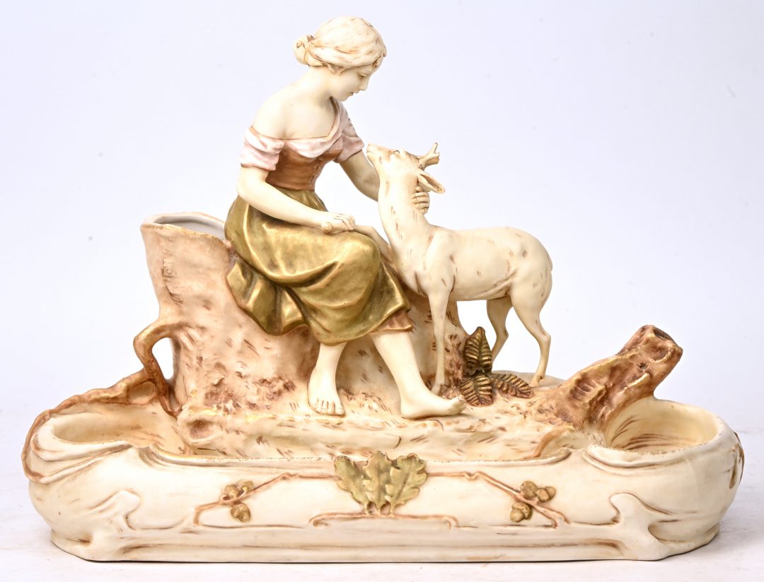 "Young woman with deer". A porcelain sculpture, marked Royal Dux.