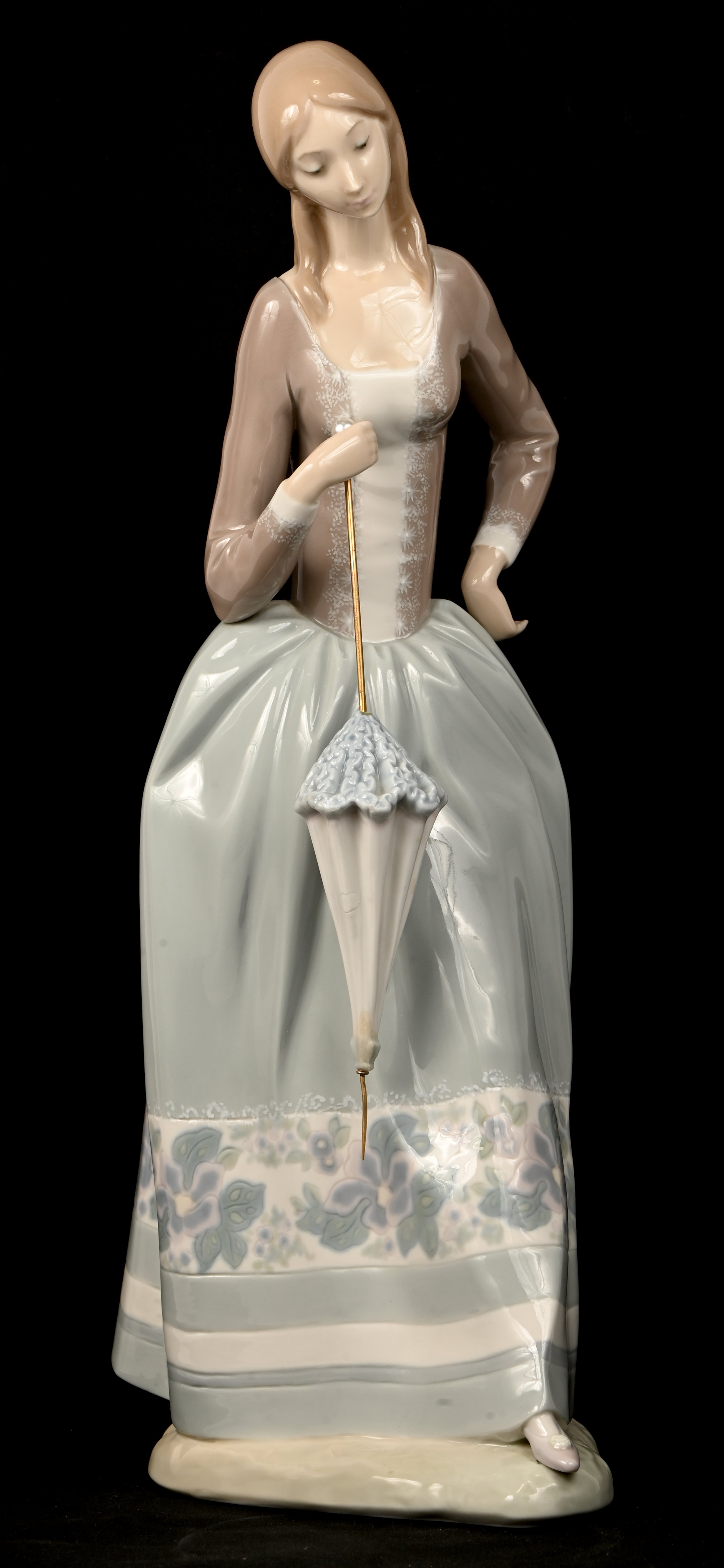 #8Een antiek popje uit biscuit in rond metalen (wandel)rekje.