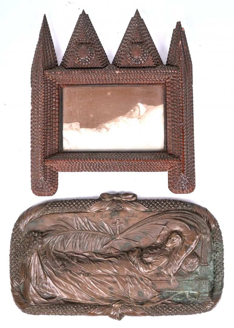 "Young woman on her deathbed," a bronze bas relief. Signed A. Verrebout. Accompanied by an old photo of a woman on her deathbed, in a homemade frame.